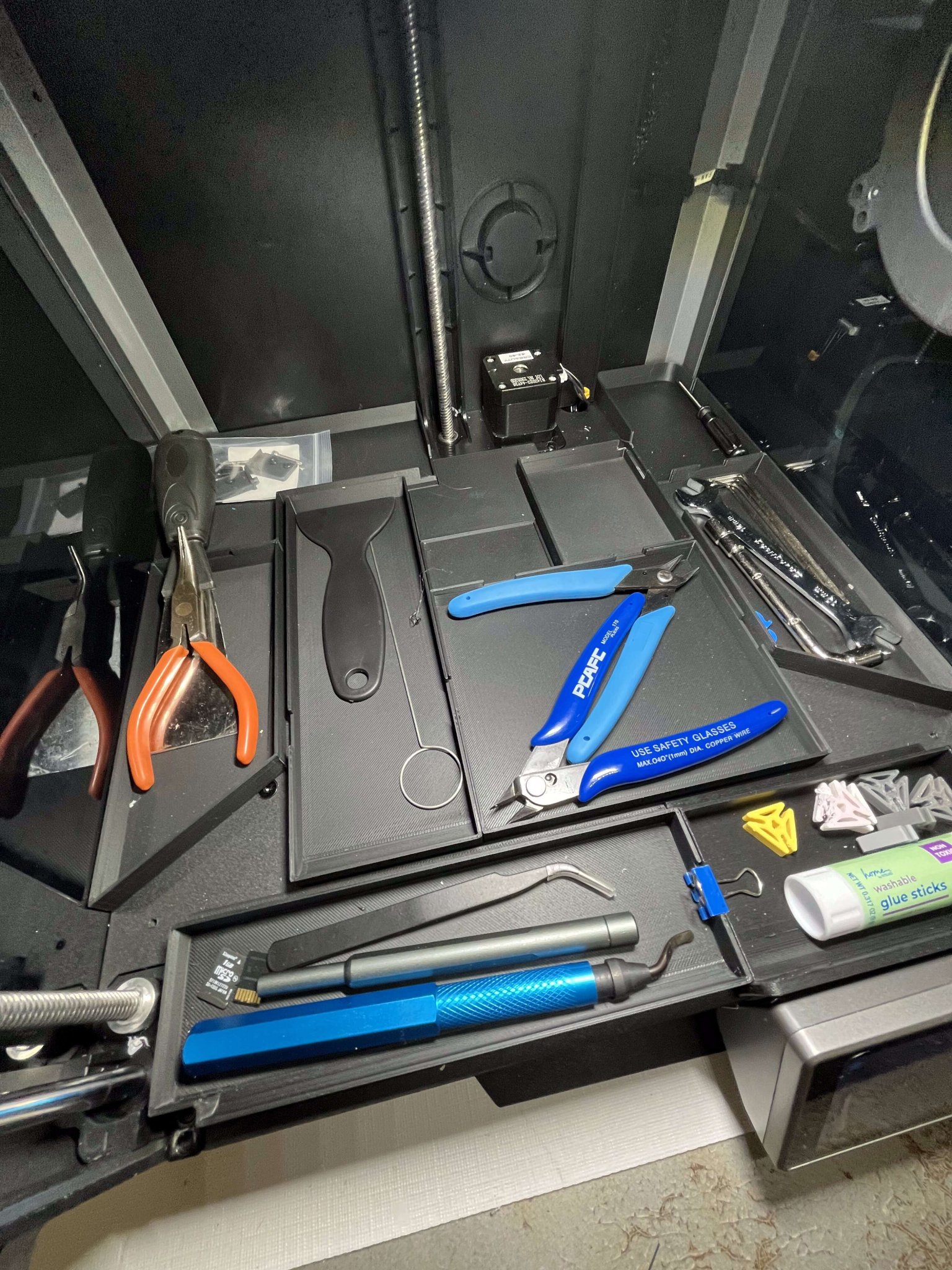 Anything stored in the center trays _must not_ protrude above the tray wall, to avoid interfering with a fully lowered hotbed (there _might_ be 1mm margin, though I doubt there are 2mm).