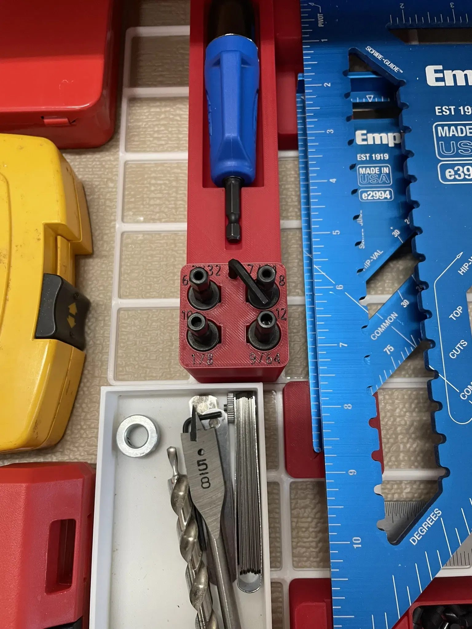 Cái hộp này để đựng mấy mũi khoét lỗ Snappy Tools chuẩn Gridfinity nè. In bằng Prusa MK4 với PLA Red Ice, dùng băng dính hai mặt để giữ cho chắc, tiết kiệm không gian tối đa. In xong là gọn gàng liền!