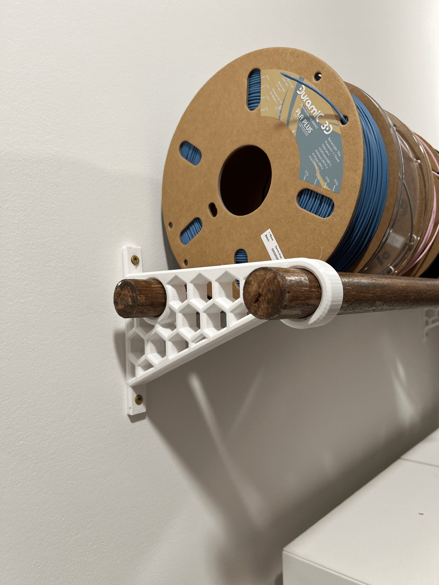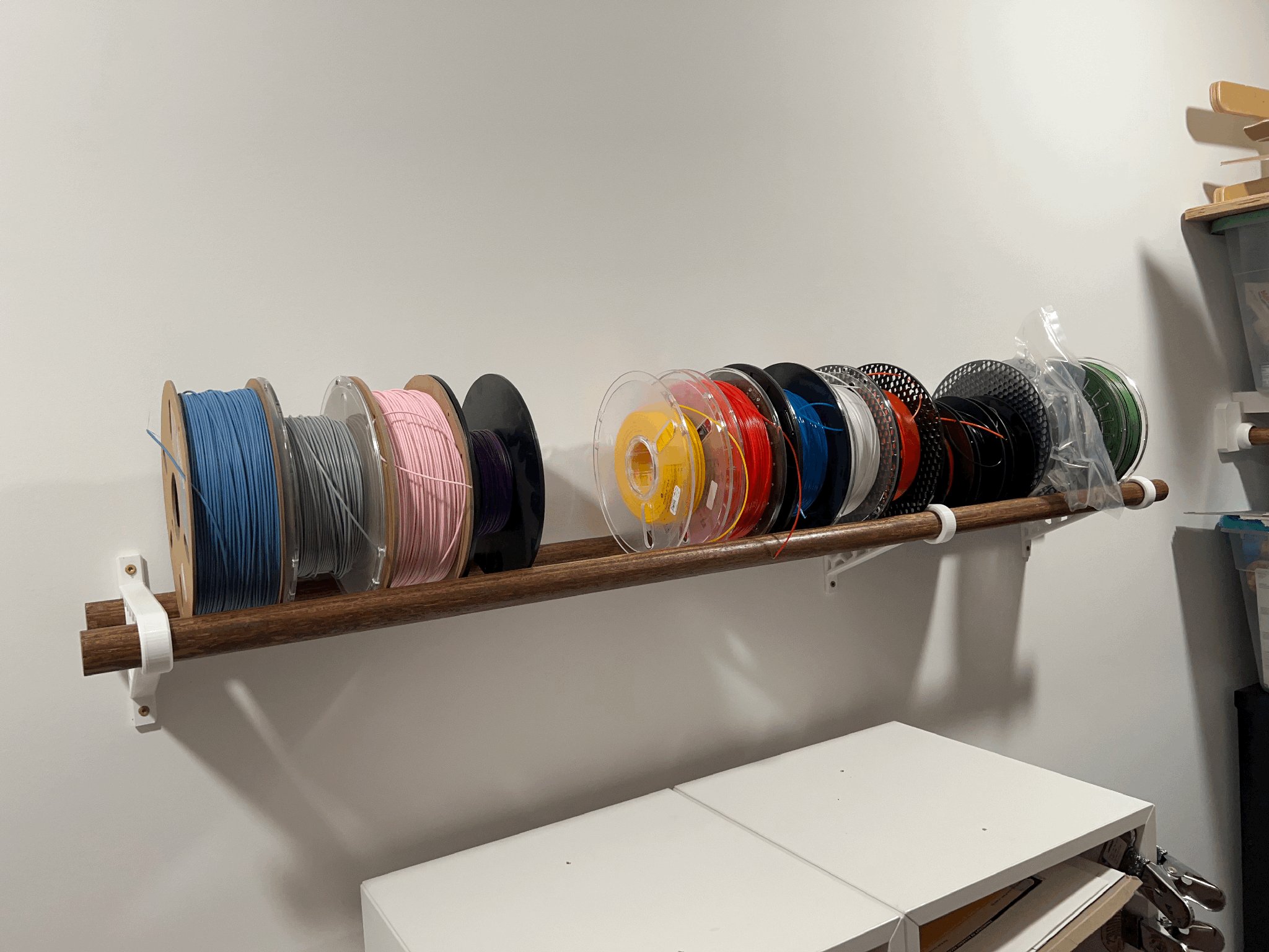 Kệ treo cuộn filament này dùng thanh tròn 1-¼ inch, loại hay dùng làm thanh treo đồ. Giúp bạn cất giữ cuộn filament gọn gàng trên kệ.