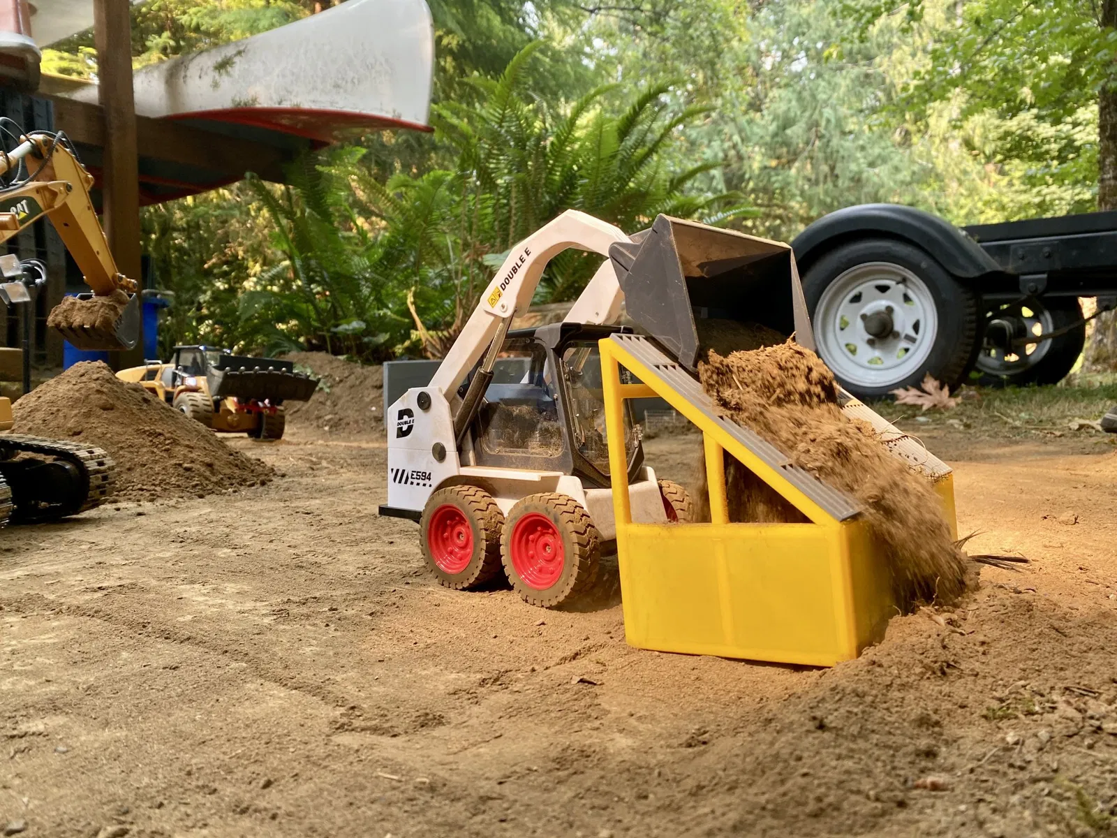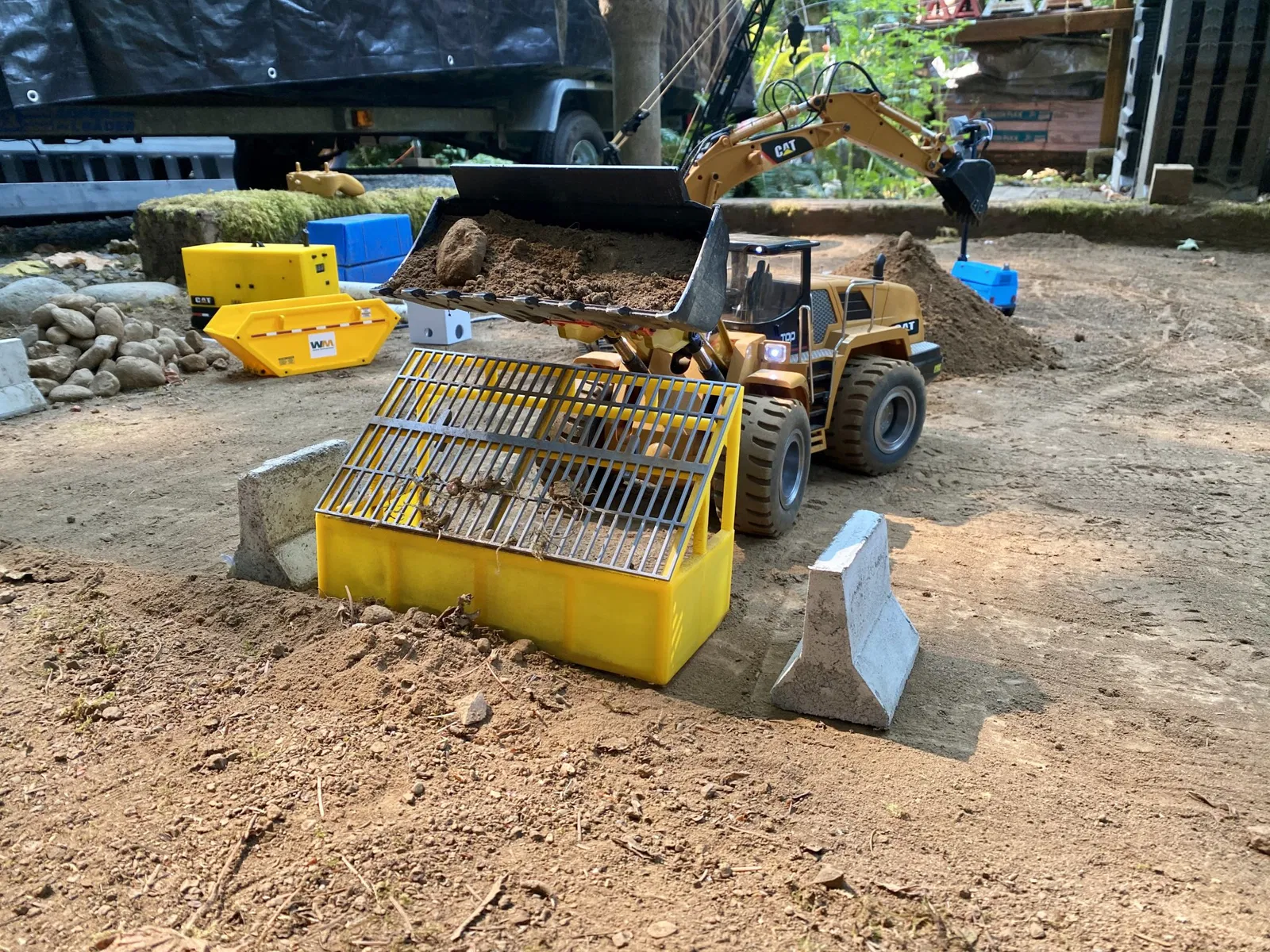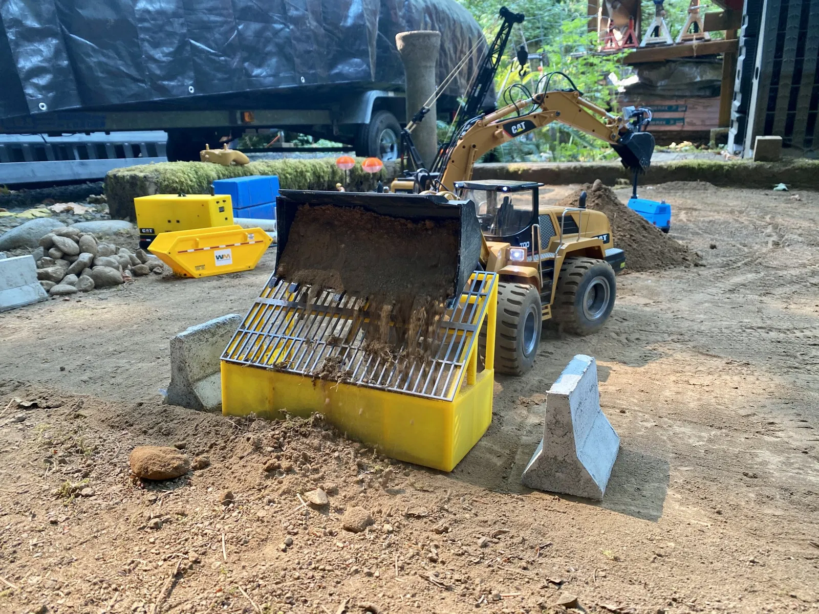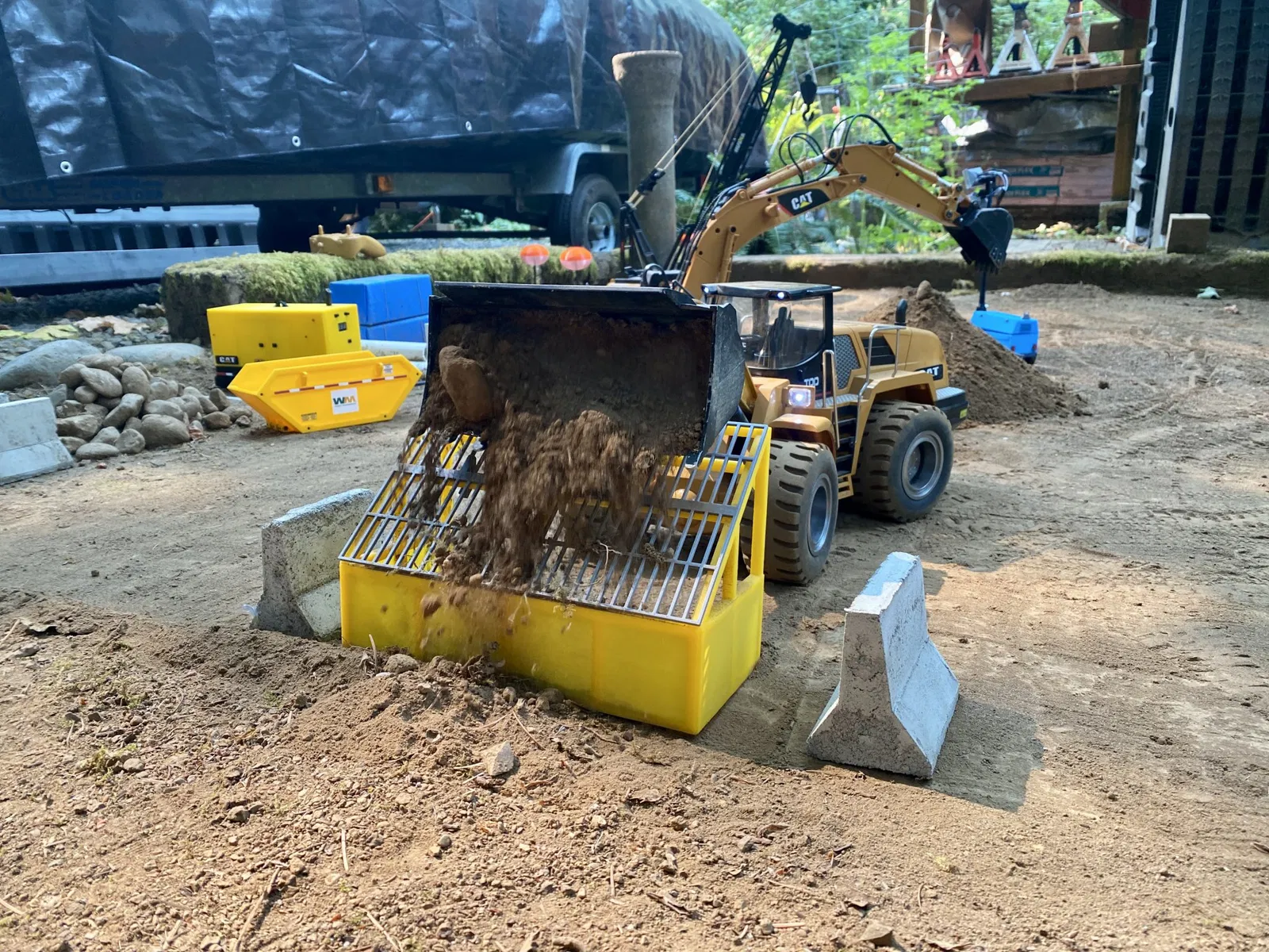 Kinder cho đá trong bụi bẩn trên một trang web xây dựng RC quy mô.