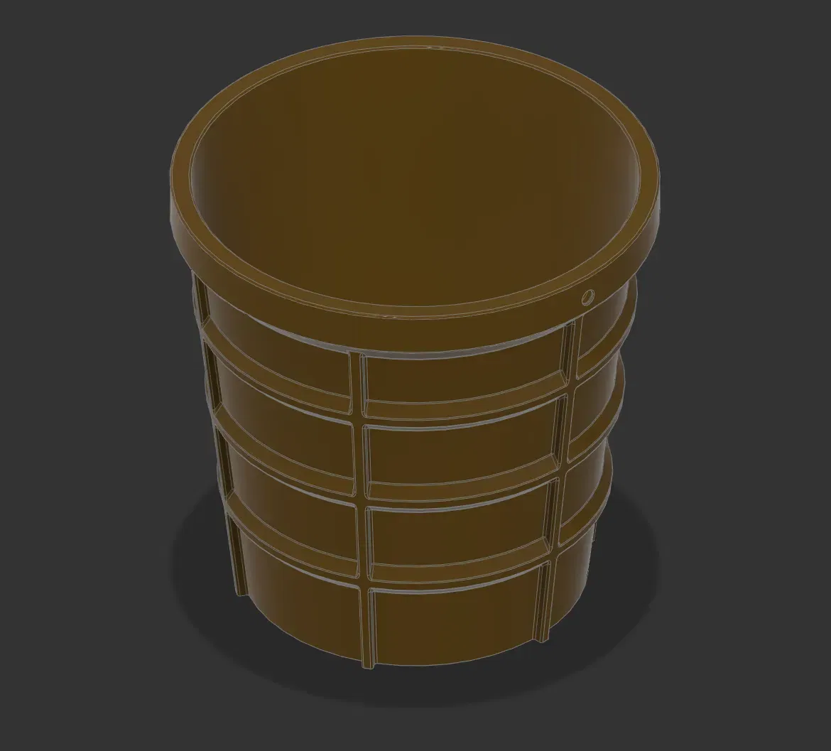 Một cái xô có các gân gia cố, có thể dùng làm chậu hoa, chậu cây cảnh. Thiết kế gia cố giúp tăng độ bền cho sản phẩm.