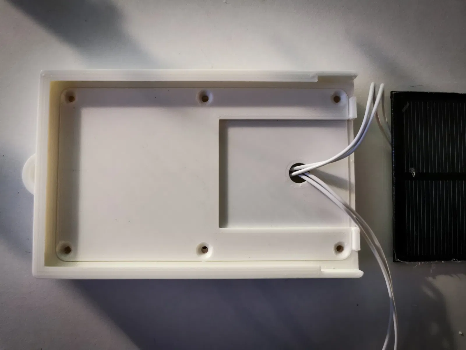 - LED Light (battery powered) - Solarpanel (5V 250mA - 110x69) - Solar Charge Controller - 4x AAA-Battery - AAA-Battery contacts + - AAA-Battery contacts - - little Screws