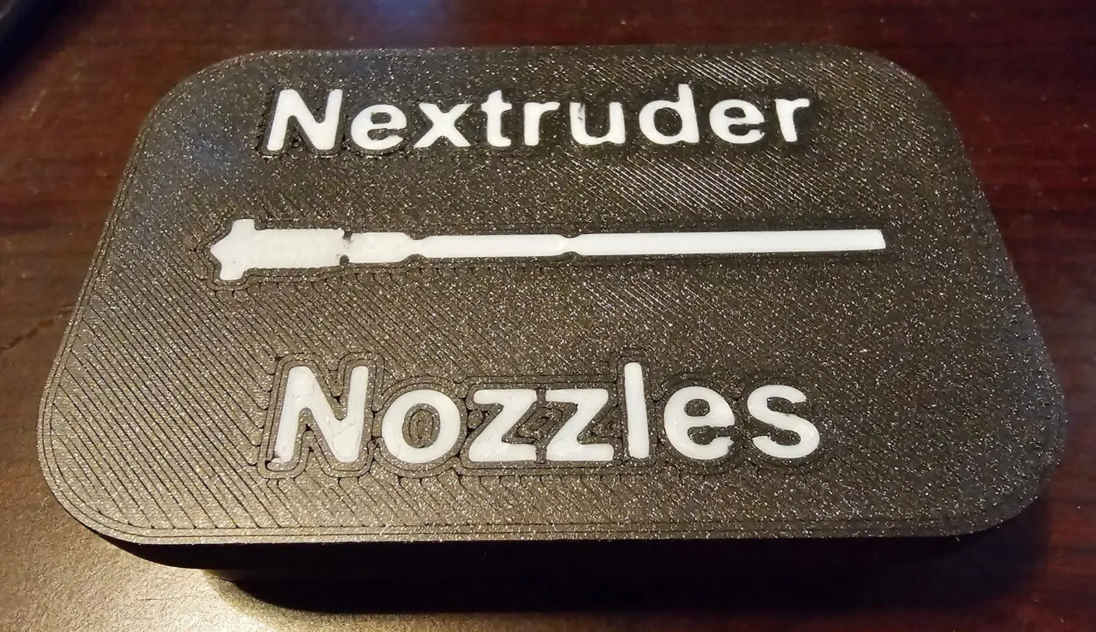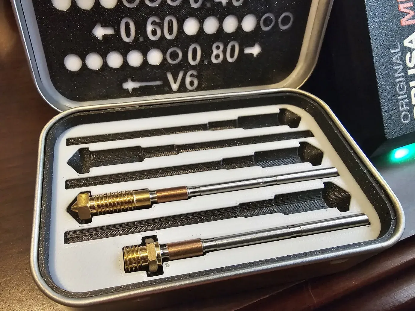 Sau khi tìm kiếm mấy cái đế cắm cho vòi phun Nextruder, tui muốn có một cái gì đó tối giản thôi. Cái hộp này có thể đựng tới năm vòi phun Nextruder cộng thêm cả cái adapter V6 nữa đó. Ngoài ra, nó còn có một bảng mã nhận dạng, ép nhẹ vào nắp hộp là được. Mấy cái chấm nhỏ kế bên kích cỡ vòi phun tương ứng với số chấm trên phần lục giác của vòi phun Nextruder.