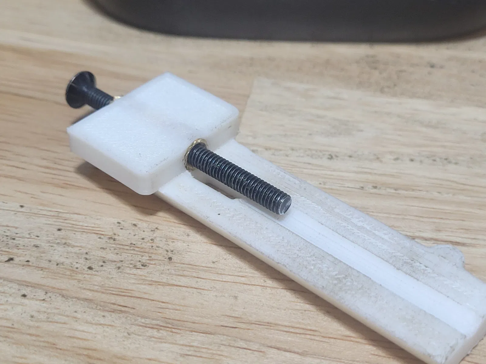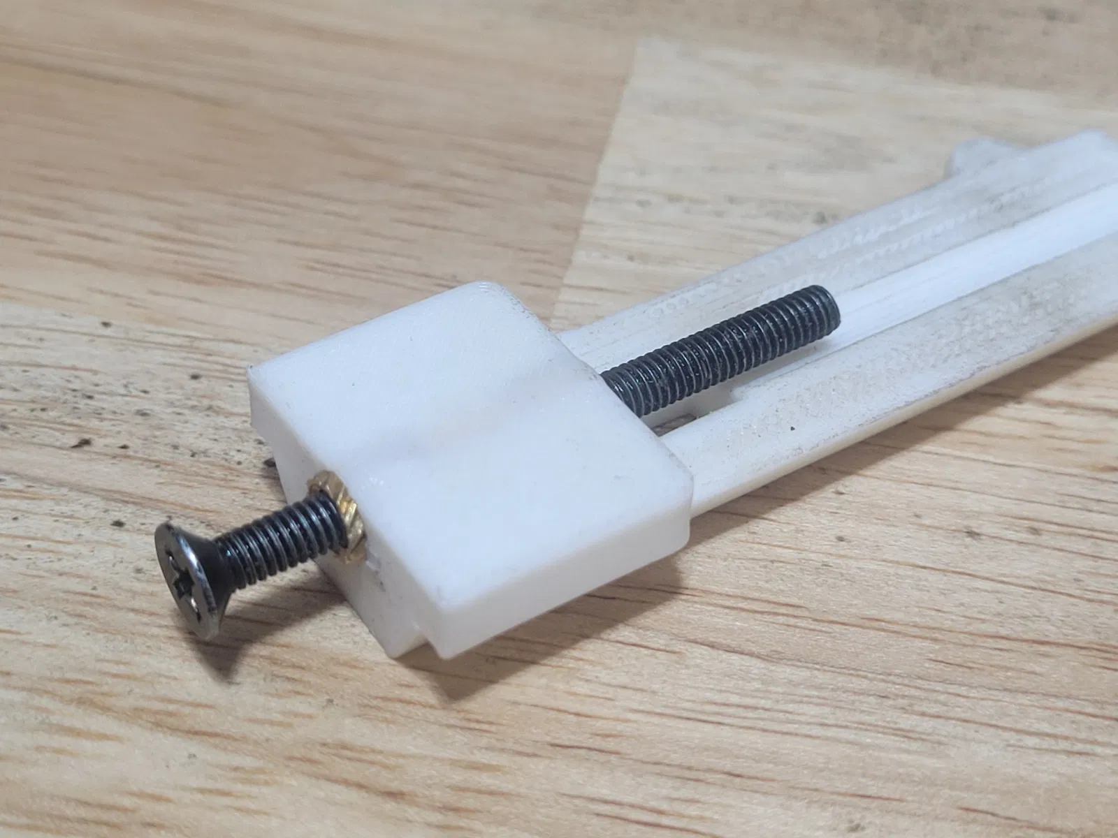 Sử dụng hai ốc ren đồng M4xH10, cái ốc phía dưới ren được khoan bỏ, nó chỉ để giữ cho ốc vít không bị lắc lư thôi. Đầu laser hơi lắc một chút khi lấy nét xa khỏi bàn in nhưng không ảnh hưởng tới mấy cái khắc của tui nha. Lựa chọn giữa lấy nét mượt mà và bị lắc. Để loại bỏ cái lắc, cái jig nó fit hơi chặt. Nó tốt hơn nhiều so với con ốc vân xoắn đi kèm theo máy.
