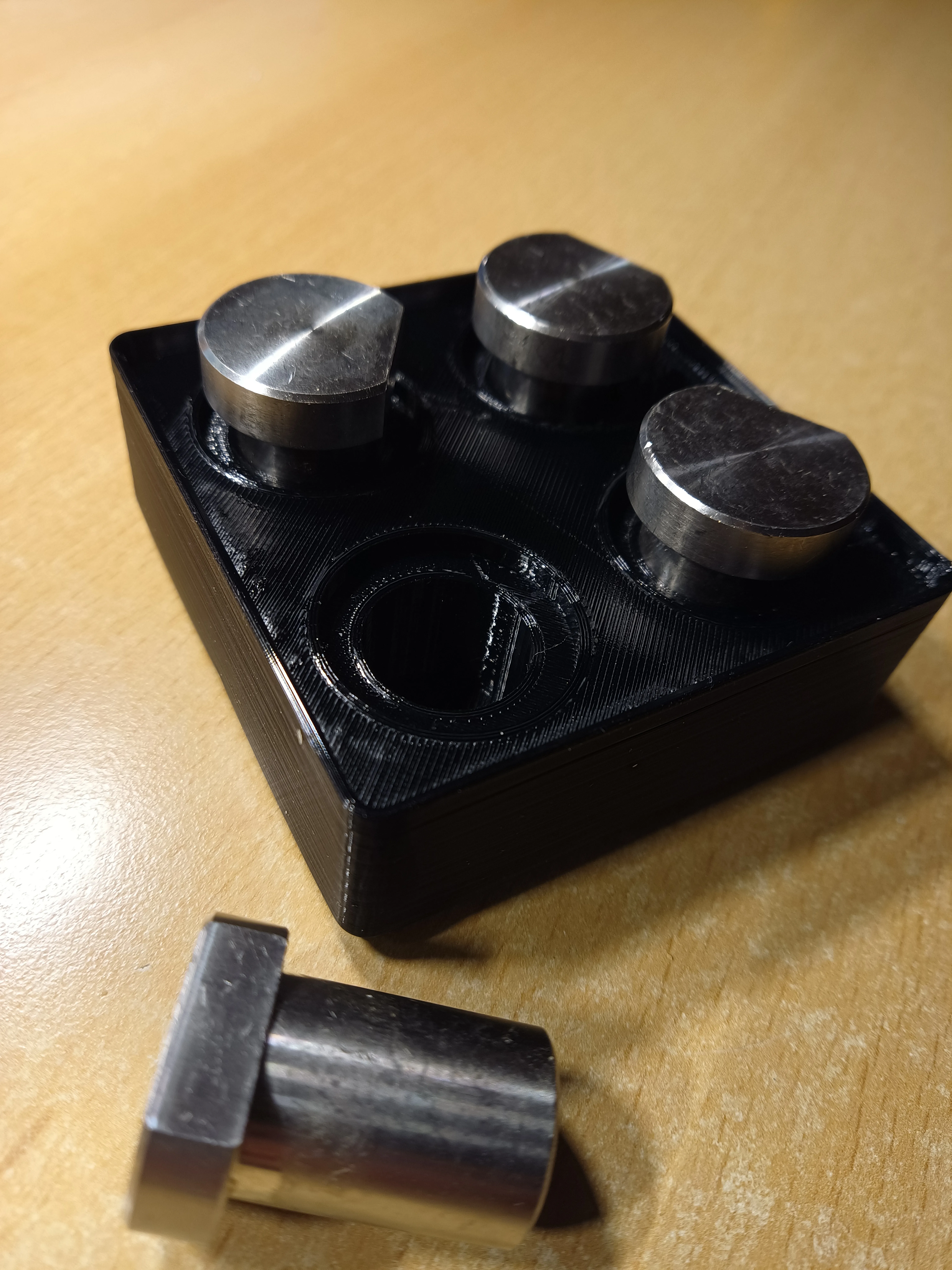 Người giữ Gridfinity 2x2 cho 4 Benchdogs/Dogs Gỗ/Bankhaken. Đường kính băng ghế dự bị: 20 mm in trong TPU (linh hoạt)