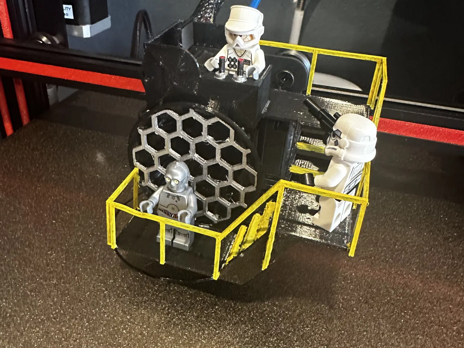 Loved the original design but I wanted to make a few changes and of course make it work on my Max Neo. I Added A venturi and fan mount with a screen and a clip mount for the whole assembly so the assembly is easy to remove without tools clip is designed for the ender 3 Max Neo. I Added back Rails and Rearranged the controls. I Printed on its back with supports everywhere support density at %5 with Petg with 6 lines and .4 nozzle. I also separated all rails and small parts and screen to reduce supports I just Glued them on we also heated up one rail after install to bend it to look like they dropped the fan cover on it. This is a super fun print my kids get a kick out of watching the storm troopers and droid run my printer. Happy Printing……