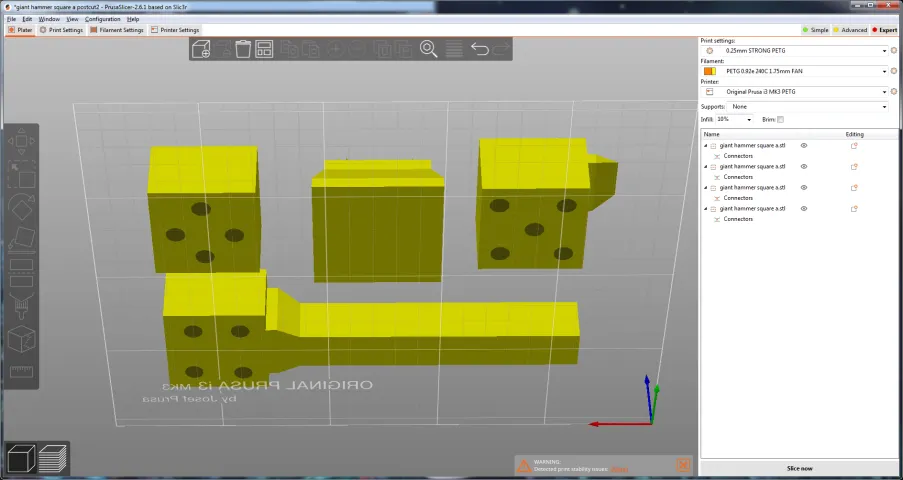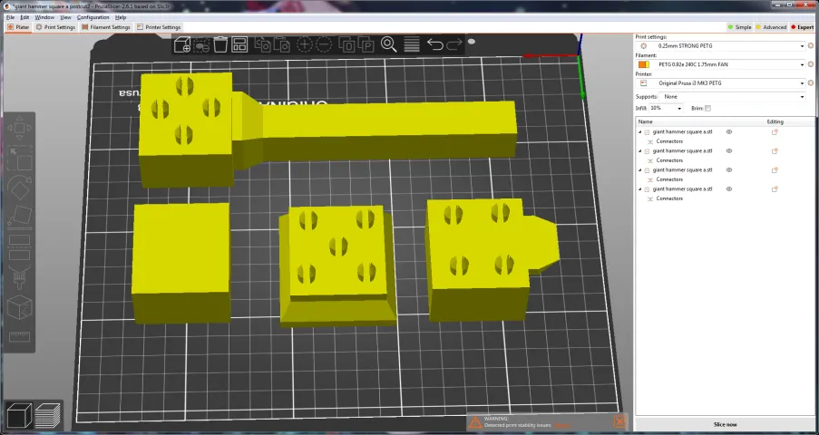 Cái này là dành cho một trò chơi chiến đấu trực tiếp, trong đó mục tiêu của một đội là thu thập các mảnh của một cây búa cổ và sau đó lắp ráp nó lại. Mô hình cây búa có thể được chia thành nhiều mảnh bằng tùy chọn “cut” của PrusaSlicer.