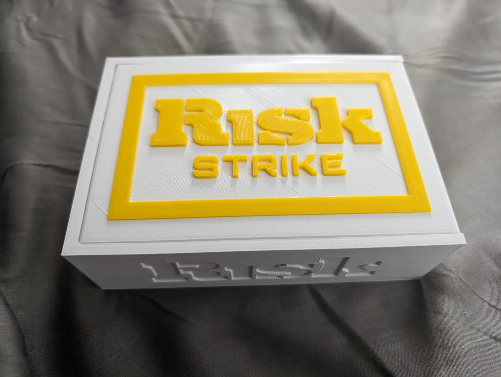 Box for storage of Risk Strike card game. It's really easy to print, fits all the parts and can be done in any colors.