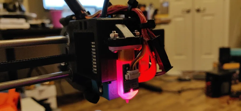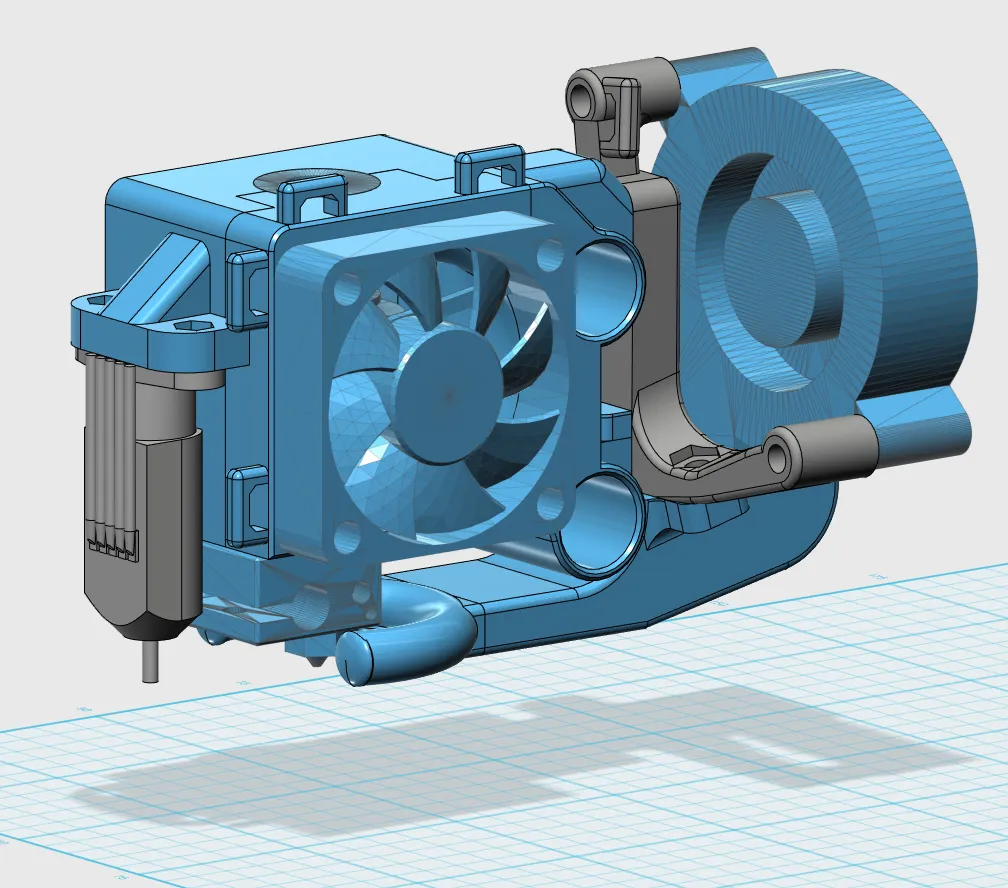 Nâng cấp cuối cùng tôi cần là cân bàn tự động (auto bed leveling). Tôi đã lắp BLTouch khoảng một năm trước, nhưng không hài lòng với những nỗ lực vụng về của mình trong việc tạo ra một ngàm E3D tốt với bộ phận chứa trục X (carriage) gốc. Tôi đã tìm thấy một bộ phận chứa trục X thay thế tuyệt vời ở đây, https://www.thingiverse.com/thing:3134206, và tôi đã sử dụng nó làm cơ sở cho bộ phận của mình. Tôi cũng muốn di chuyển quạt làm mát bộ phận (part cooling fan) ra phía sau bộ phận chứa trục X và tôi tìm thấy thiết kế này mà tôi thích, https://www.thingiverse.com/thing:1246425, và sử dụng nó làm điểm khởi đầu cho thiết kế của mình.
