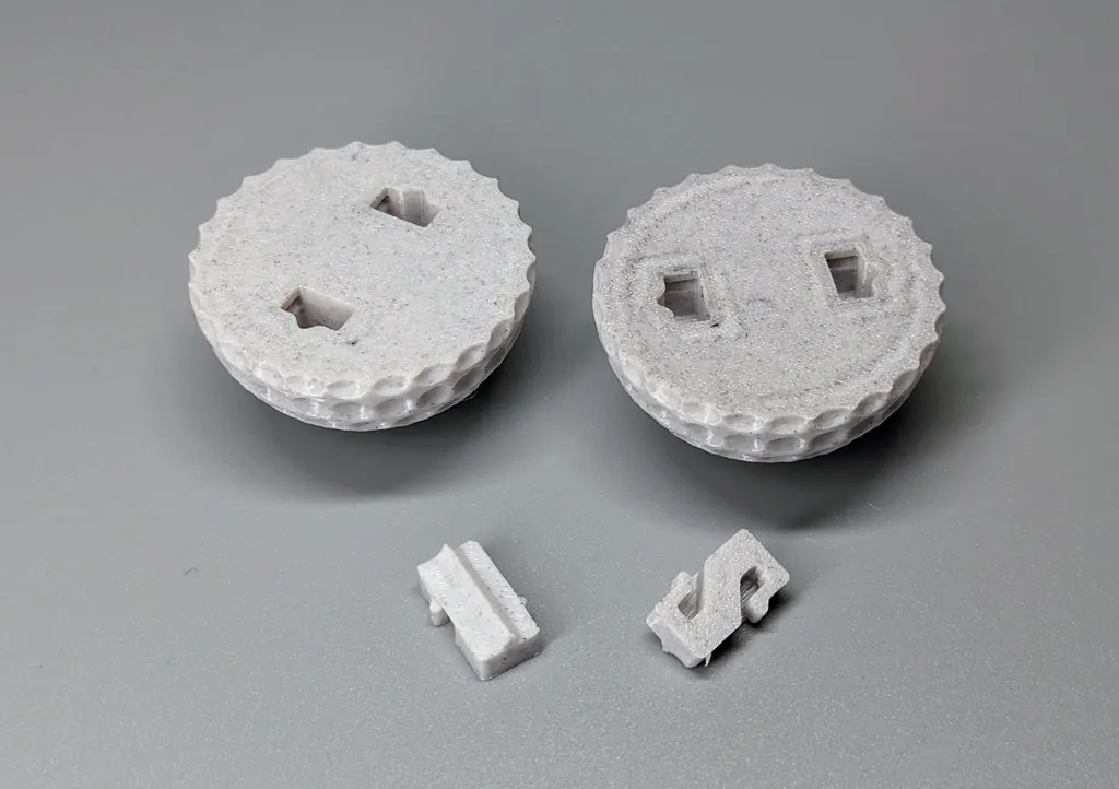 Because every spool of filament can vary in composition, you may have to adjust the locking pin slot/hole size using the X-Y hole compensation setting. I suggest adjusting the setting by (+/-) .1mm increments to get the best fit and to make it easier to assemble.
