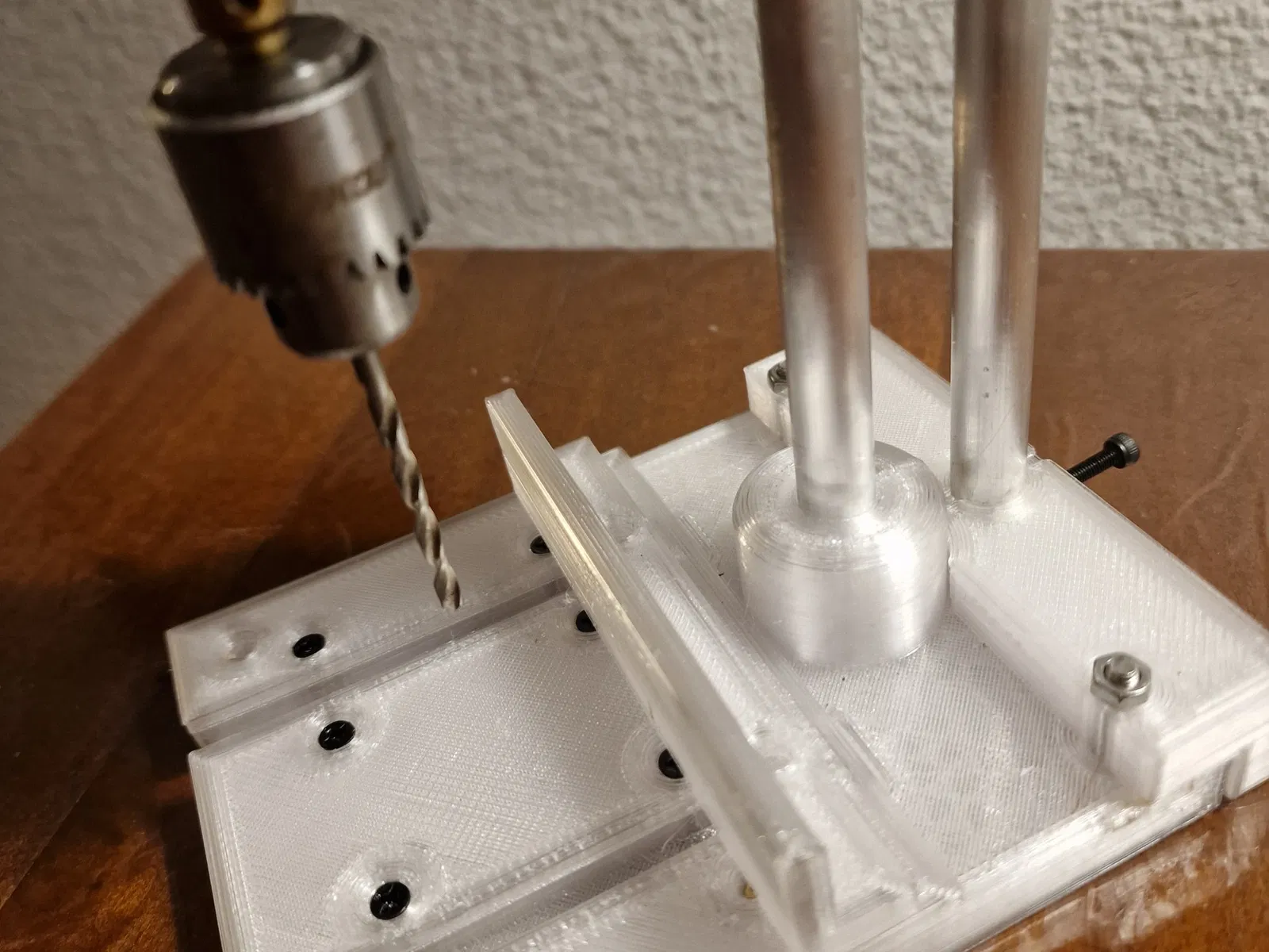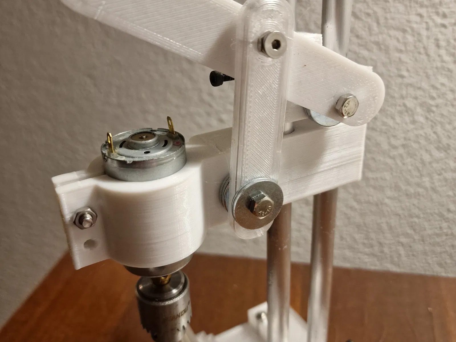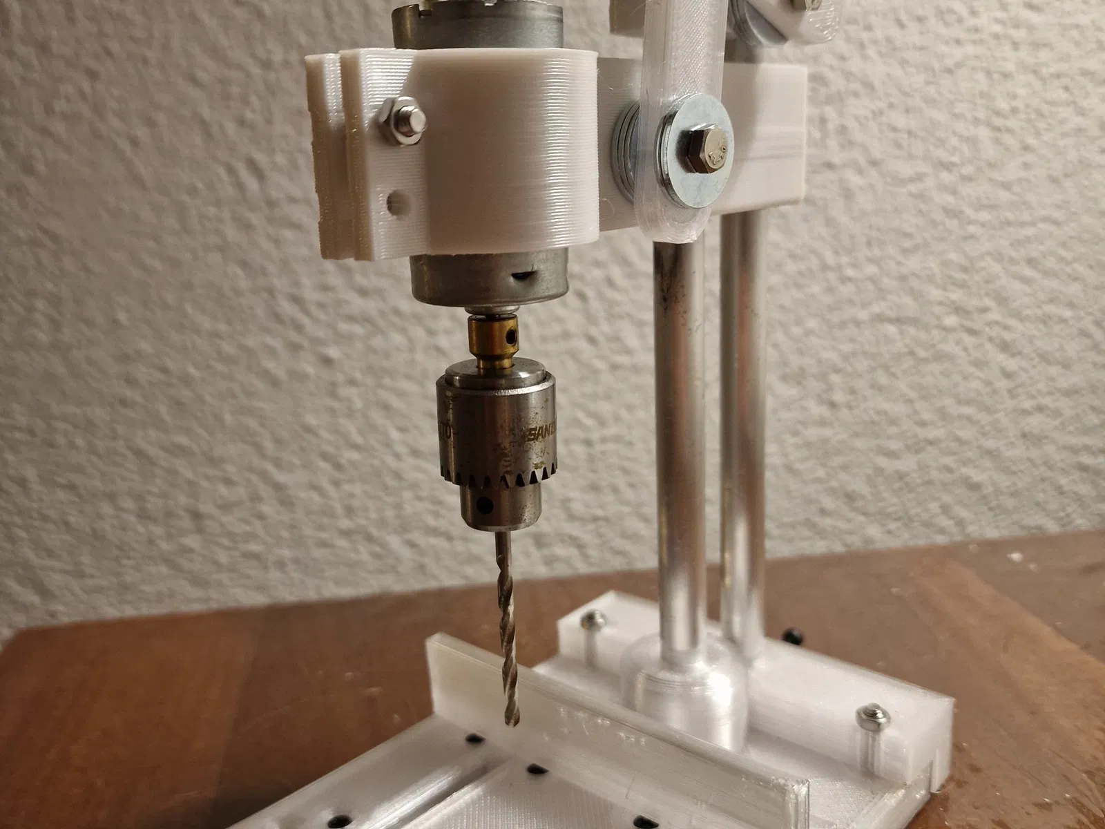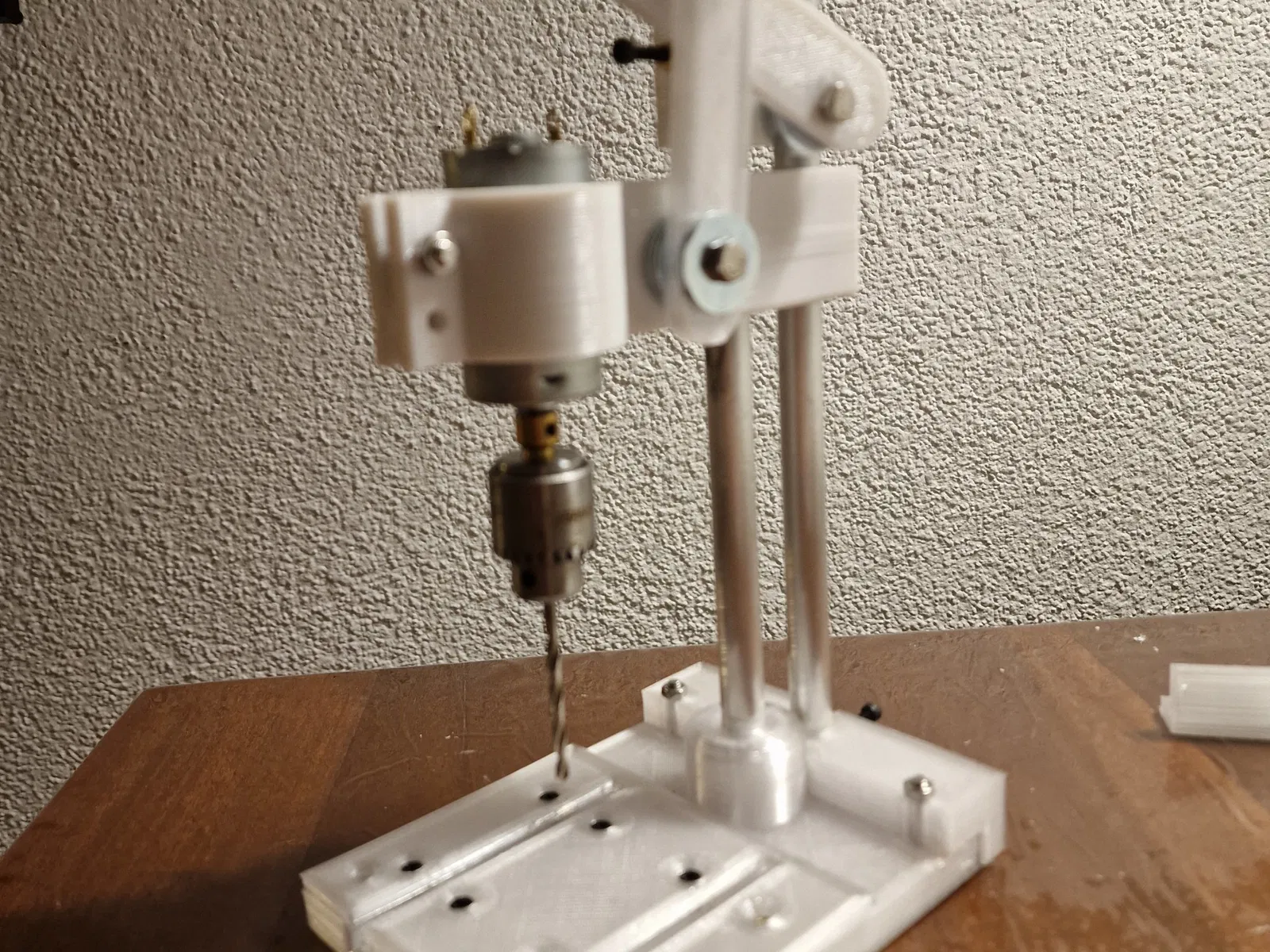 Mô hình máy khoan mini dễ dàng in bằng PLA hoặc PETG, bao gồm các bộ phận chi tiết và vật liệu cần thiết để lắp ráp.