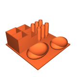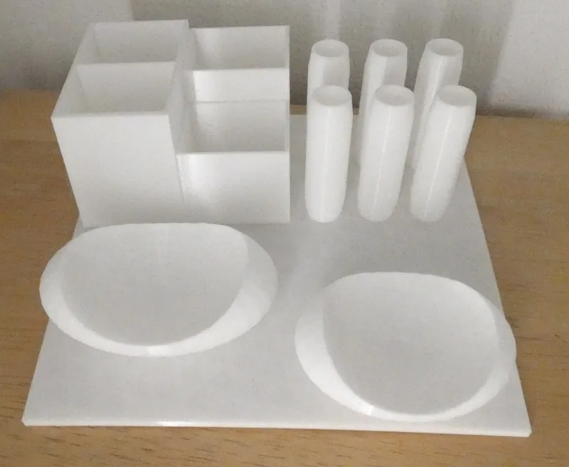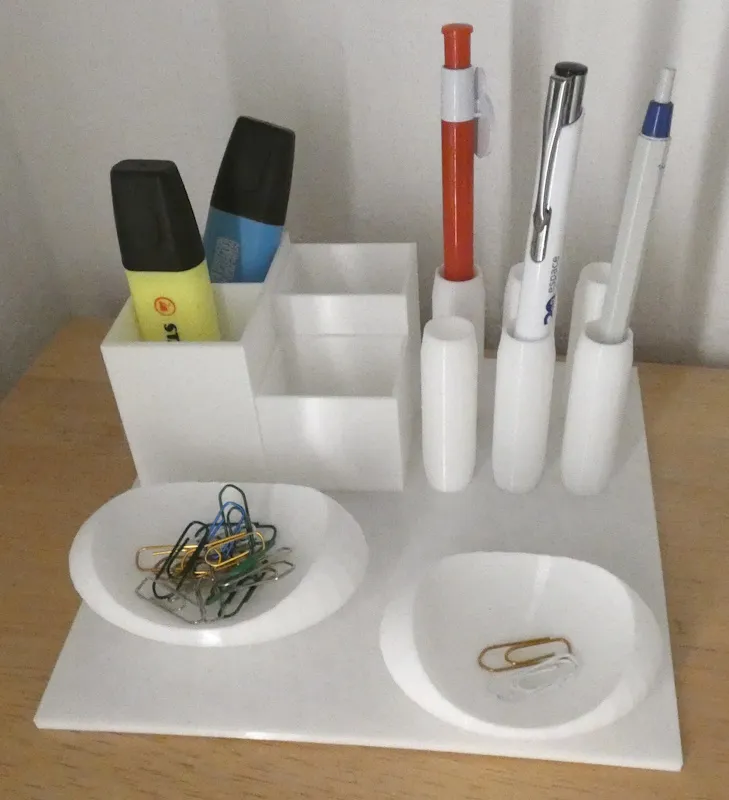 Kệ đựng đồ văn phòng 3D với 4 ô, chỗ để 6 cây bút và hai ngăn nhỏ. Kích thước đế 17,5cm x 17,5cm, in bằng PLA, file STL.