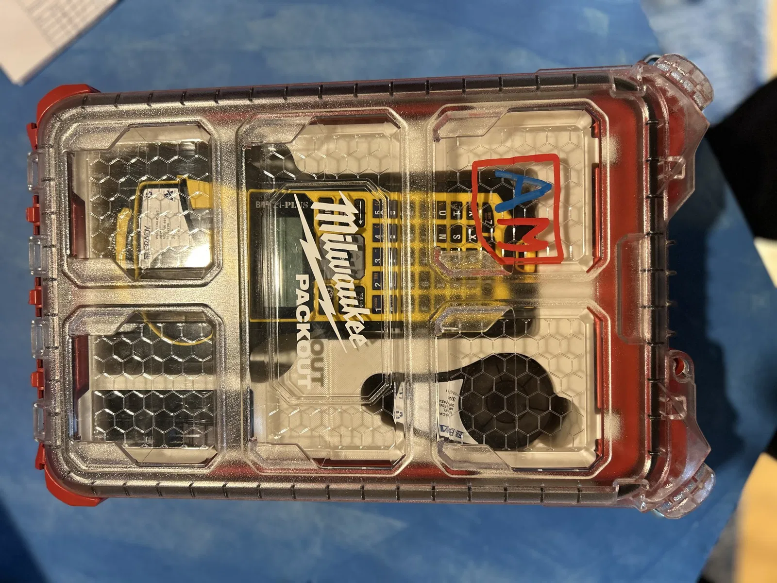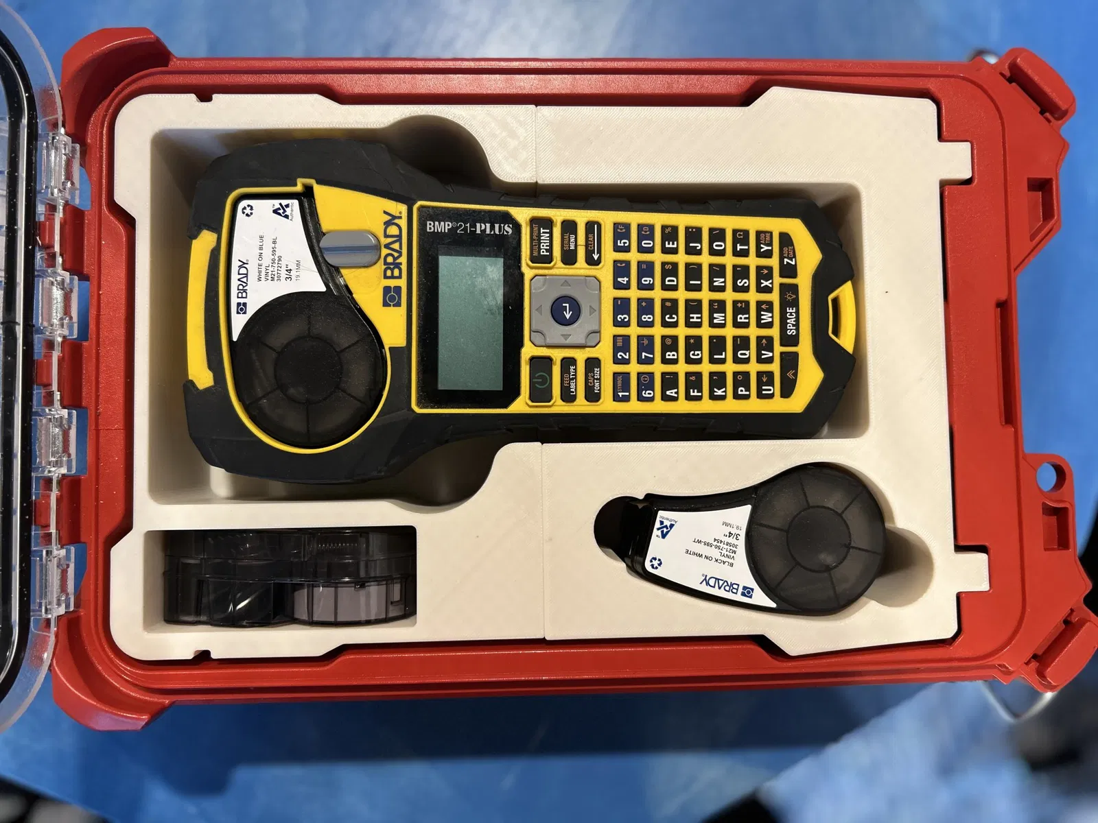 Cái đế lót này giữ gọn gàng máy in nhãn công nghiệp Brady BMP 21 Plus và 3 cuộn nhãn phụ trong hộp organizer Milwaukee Packout H-10671. Phù hợp cho ai thích sự tỉ mỉ và bền bỉ.