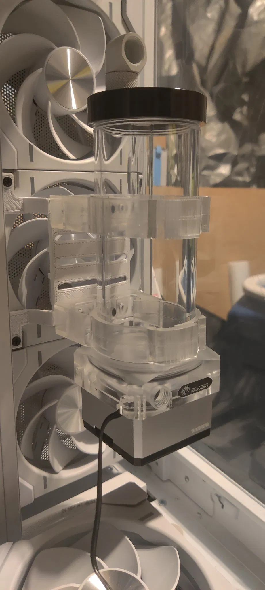 Tui làm cái giá đỡ này để gắn mấy cái bơm/thùng chứa nước hình trụ vô quạt case 120mm đó. In bằng PLA có support nha.
