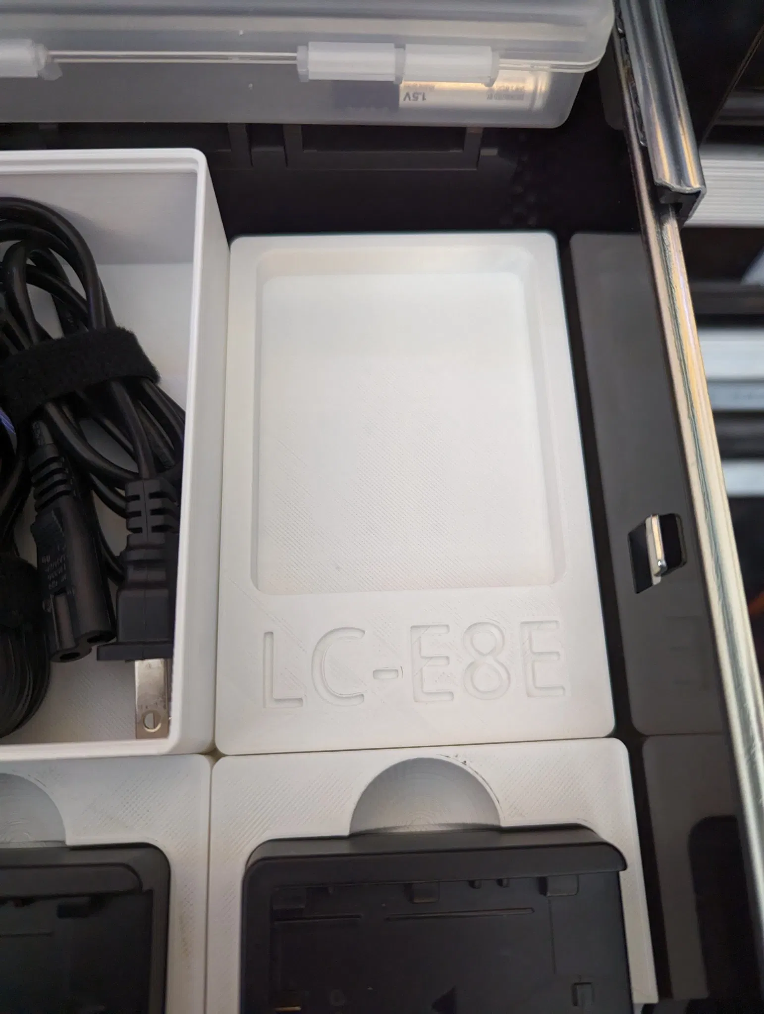 Khay Gridfinity kích thước 2x3 dùng để đựng bộ sạc Canon LC-E8E, loại sạc cho pin LP-E8. Có khắc chữ rõ ràng trên đế để dễ phân biệt.