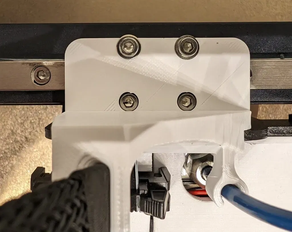 Cái đế này được gắn bằng hai con vít M3x8 vào khung gắn ray cho máy in 3D Creality CR-6 SE. Một mod đơn giản để cải thiện việc quản lý dây và ống PTFE.