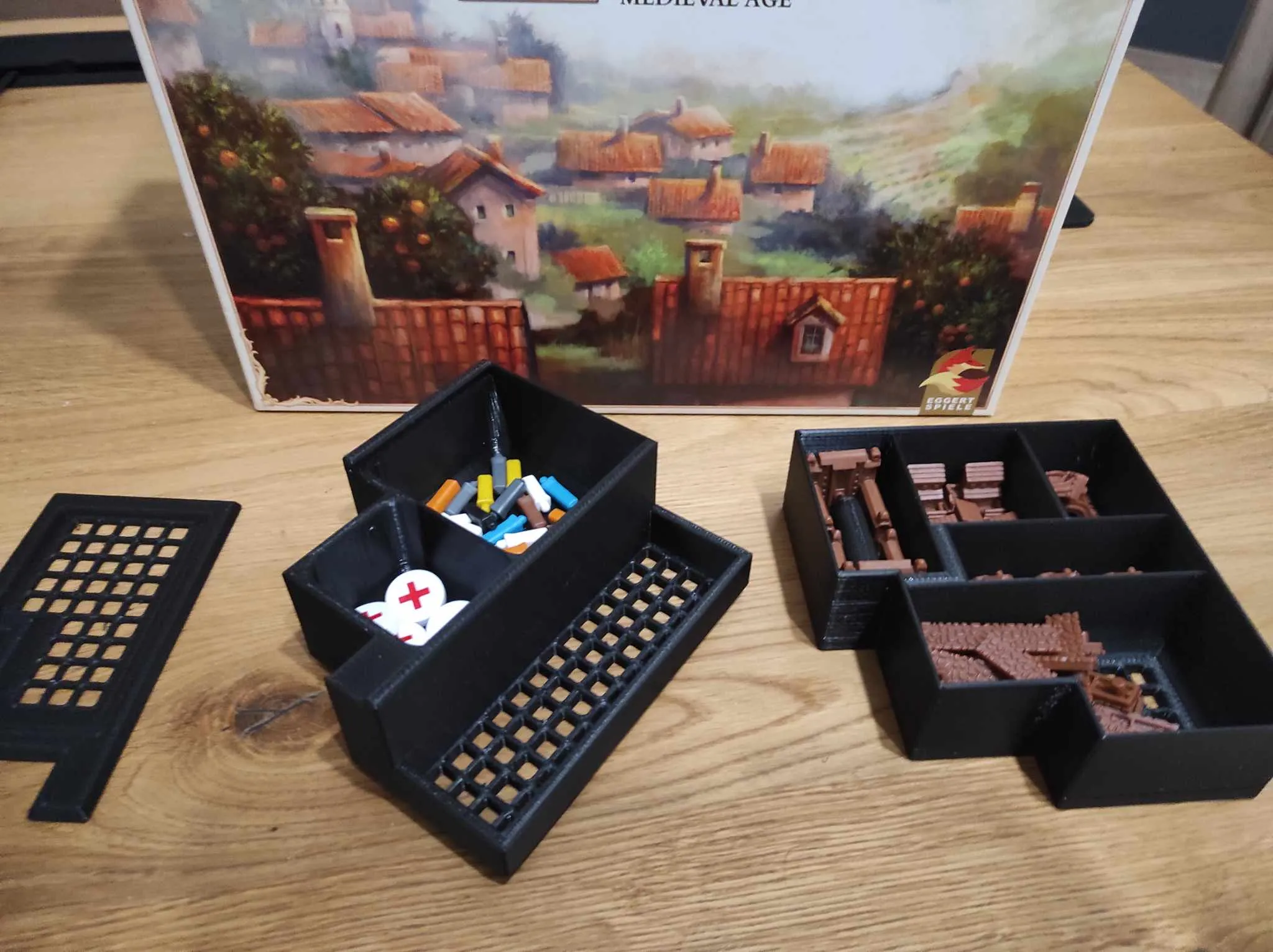 Insert module cho board game Era: Medieval Age và bản mở rộng Rivers and Roads, tập trung giảm setup và tiết kiệm không gian. Có khay dựng đứng, khay xúc xắc kiểu lâu đài, và không gian cho bản mở rộng nhỏ. Yêu cầu khoảng 1200g filament và bàn in 168x134mm. Không cần hỗ trợ in.