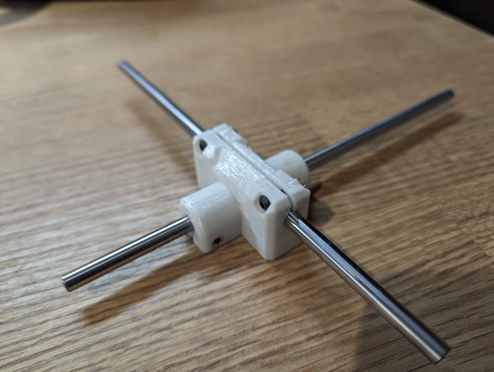 Thiết kế này cho phép kết nối cứng cáp và được điều chỉnh giữa hai thanh tuyến tính 6mm. Các bộ phận chèn với ốc vít giữ chặt thanh tuyến tính tại chỗ. Bạn sẽ cần 4x ốc M3 dài 12mm, 2x thanh tuyến tính 6mm và 4x bộ chèn M3. Hoặc bạn có thể dùng đai ốc thông thường.
