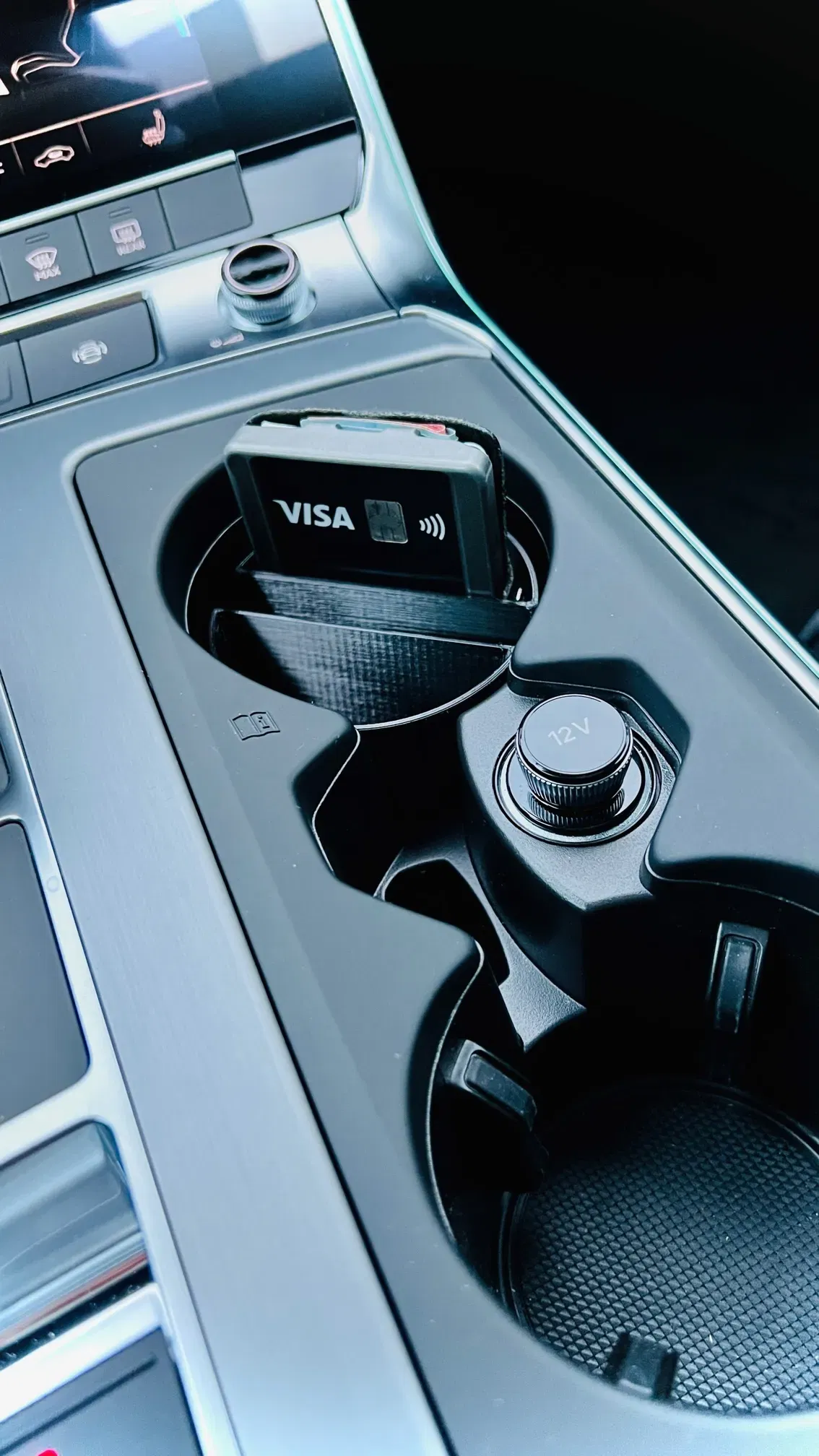 Der Getränkehalter war bisher die Ablage für mein Handy, leider machte es sich bei Kurvenfahrten gerne mal selbstständig. Daher habe ich diesen Einsatz für den Cup-Holder entworfen. Der Einsatz hat noch zwei Öffnungen für diverse Gegenstände. Mein I-CLIP findet dort auch prima Platz.