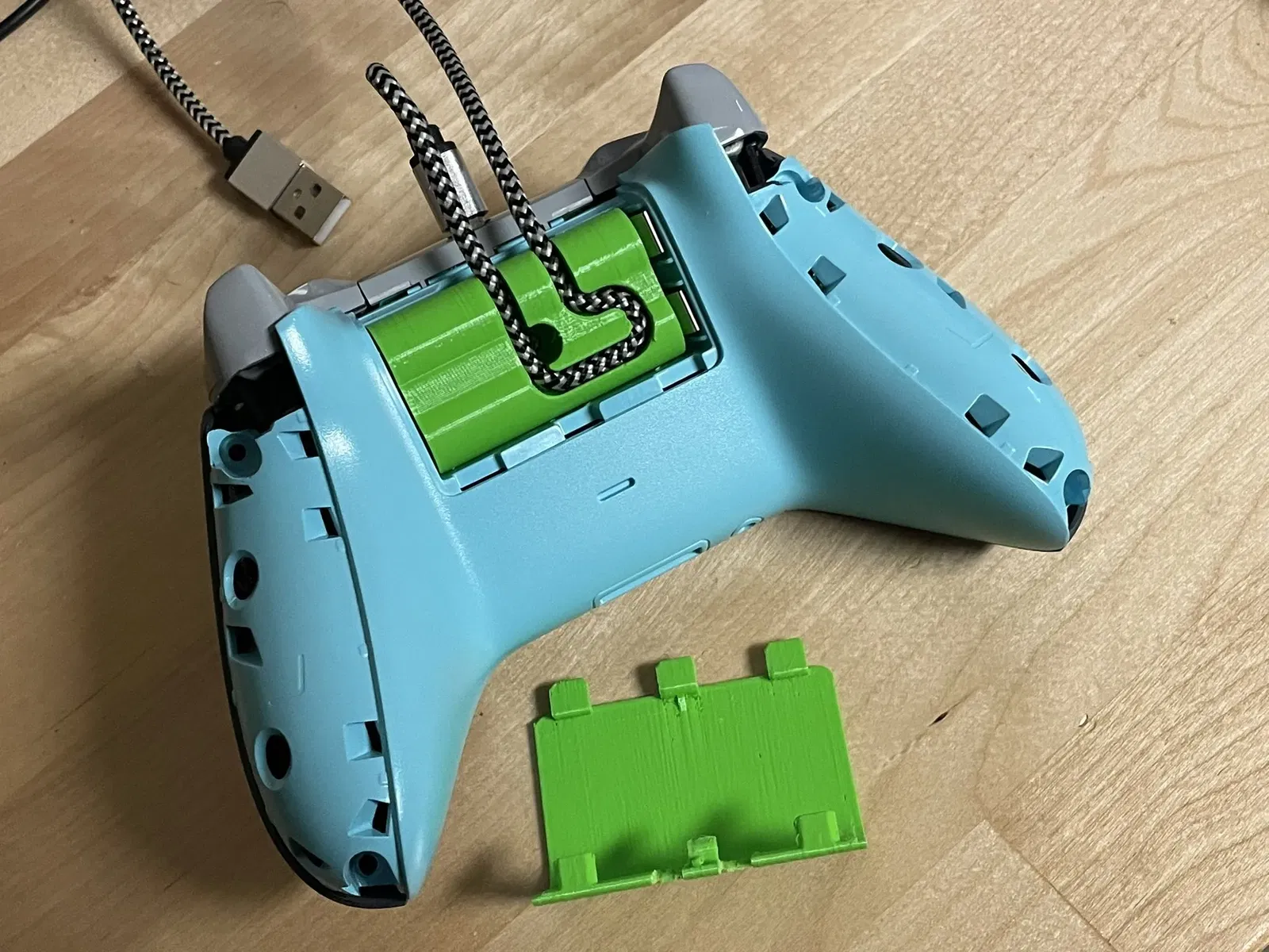 Xin chào mọi người, đây là Khối Khóa Dây Tay Cầm cho tay cầm Xbox One S. Một bộ phận in 3D đơn giản gắn vào pin và nắp che, giúp dây cáp USB không bị rút ra ngoài giữa chừng lúc chơi game.