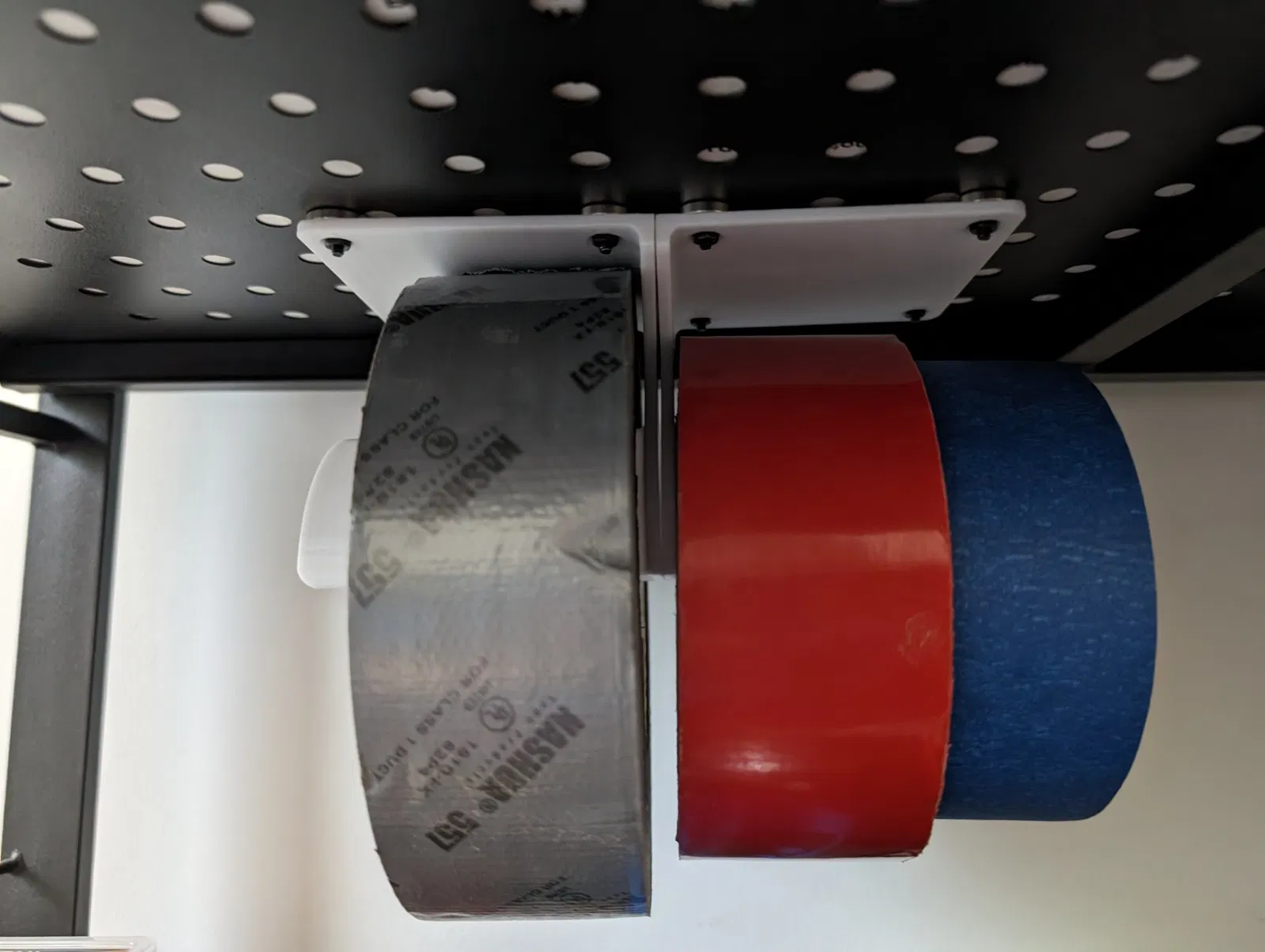 Không phải là bản chỉnh sửa trực tiếp, nhưng tui lấy ý tưởng từ mẫu của bạn @saurocksall_115308 và cái mẫu của ổng. Mẫu này để giữ các cuộn băng keo có đường kính 3 inch và đường kính trong 1 inch. Tui dùng mấy cái lỗ phía trên để gắn nam châm, rồi dán lên mặt dưới của kệ kim loại. Bạn có thể in 2 cái rồi úp lưng vô nhau y như hình nha.