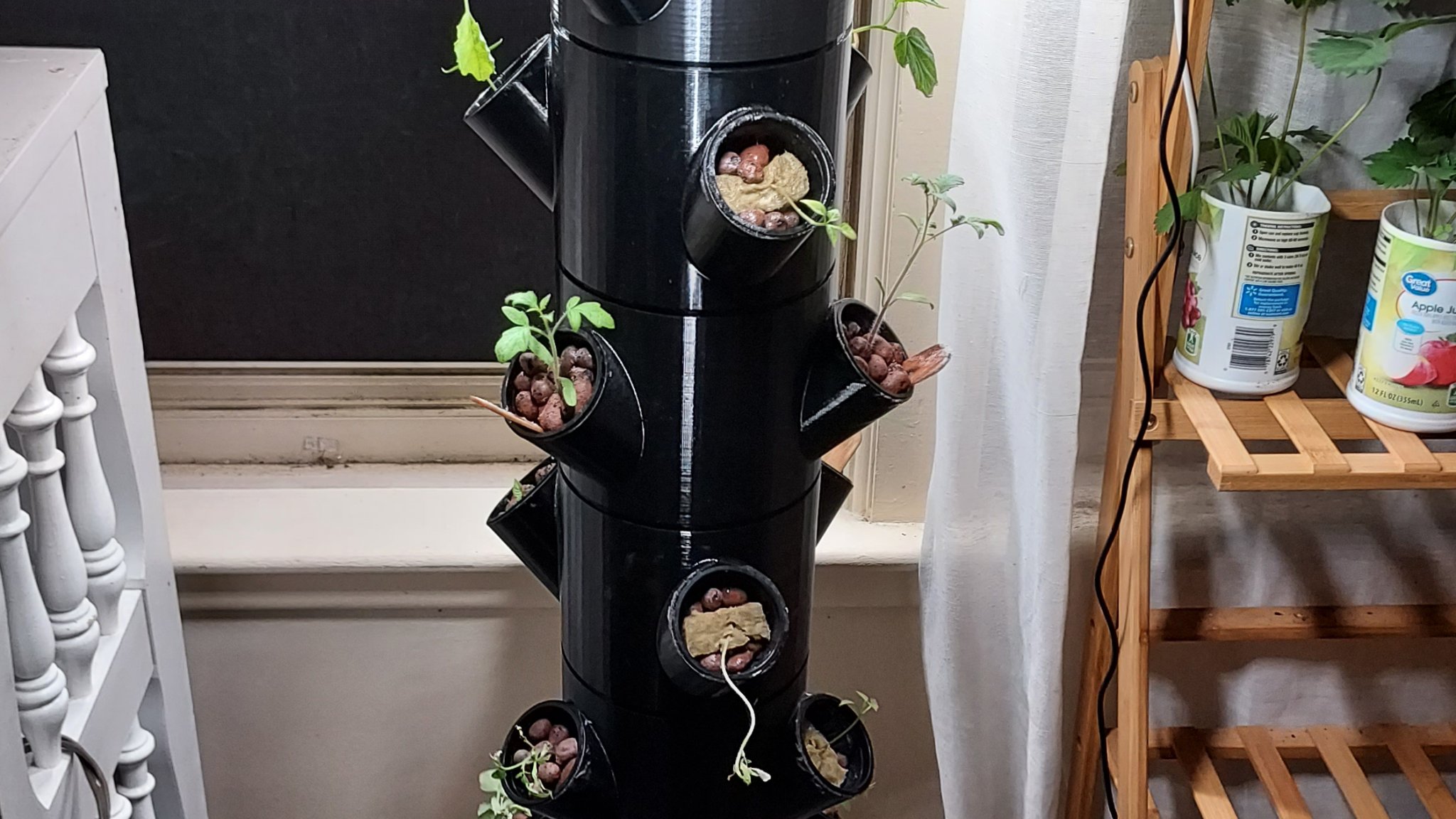 Tháp thủy canh đơn giản, có thể chồng tầng vô hạn. Đế có 3 lỗ gắn đồ, nắp có ống 1/2 inch. Lỗ rổ vừa rổ lưới 2 inch. Mỗi tầng có 3 lỗ trồng cây. Phiên bản V4 của nắp cải thiện dòng nước và giữ ống tốt hơn.