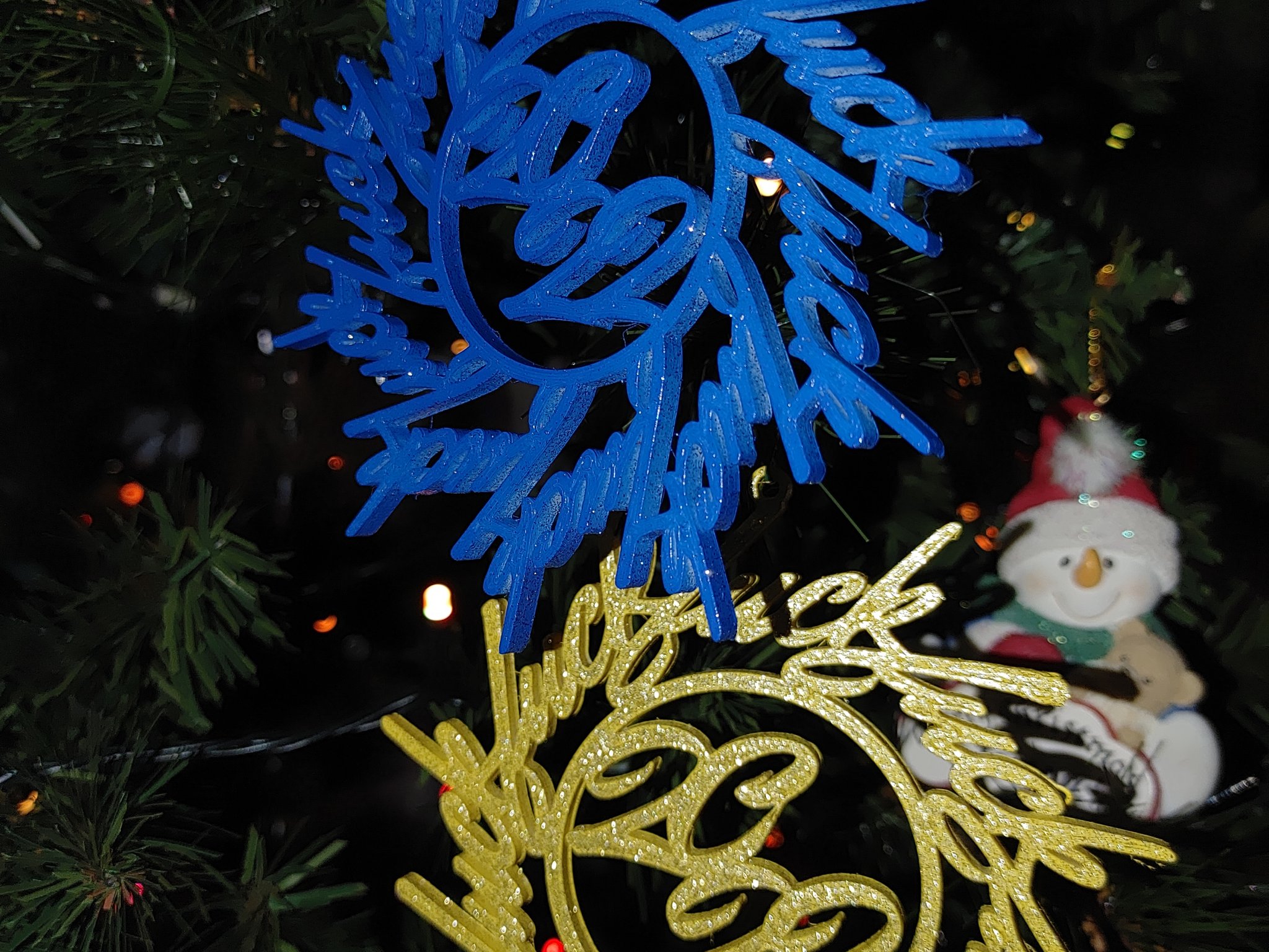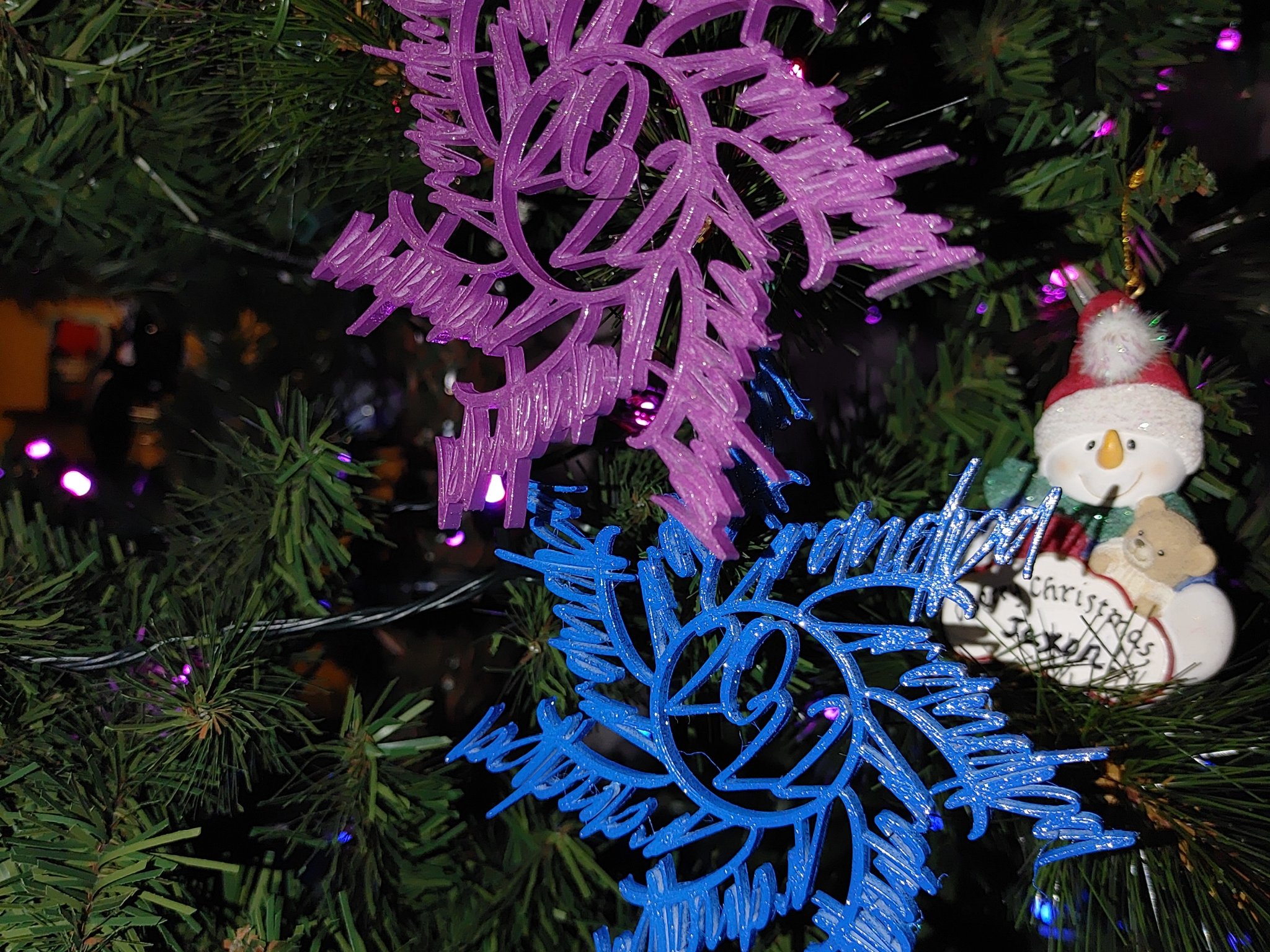 Tôi đã in những bông tuyết "f*ckflake" này được mấy năm rồi, nhưng mà thấy chán chán nên quyết định tự thiết kế bằng OpenSCAD thay vì xài Inkscape. Thấy làm với một chữ ngon lành, nên tôi làm thêm mấy chữ nữa… mỗi đứa cháu, đứa con của tôi đều có một cái. Bạn có thể xài bất kỳ font nào mà OpenSCAD hỗ trợ nha (nhưng mà có thể phải cài lại nếu bạn xài Windows mà nó chỉ cài cho tài khoản của bạn thay vì “tất cả người dùng”). Nếu bạn không muốn cài về máy và chấp nhận font chữ giới hạn trên http://fonts.google.com thì có thể xài cái customizer online trên Thingiverse nè (https://www.thingiverse.com/thing:5719286).