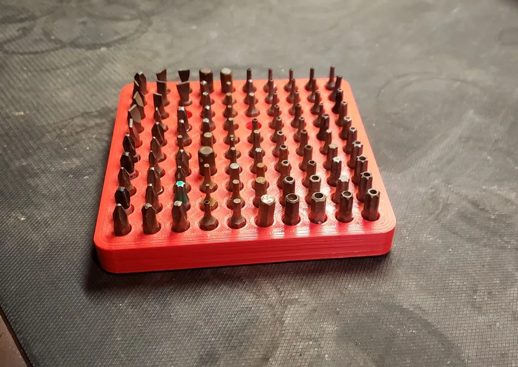 Bit holder for 100 screwdriver bits. Uses 100 - 8mm x 3mm magnets available from the usual sources. When printed at .2mm layer height pause after layer 20, glue in magnets, and resume print. Blender file included.