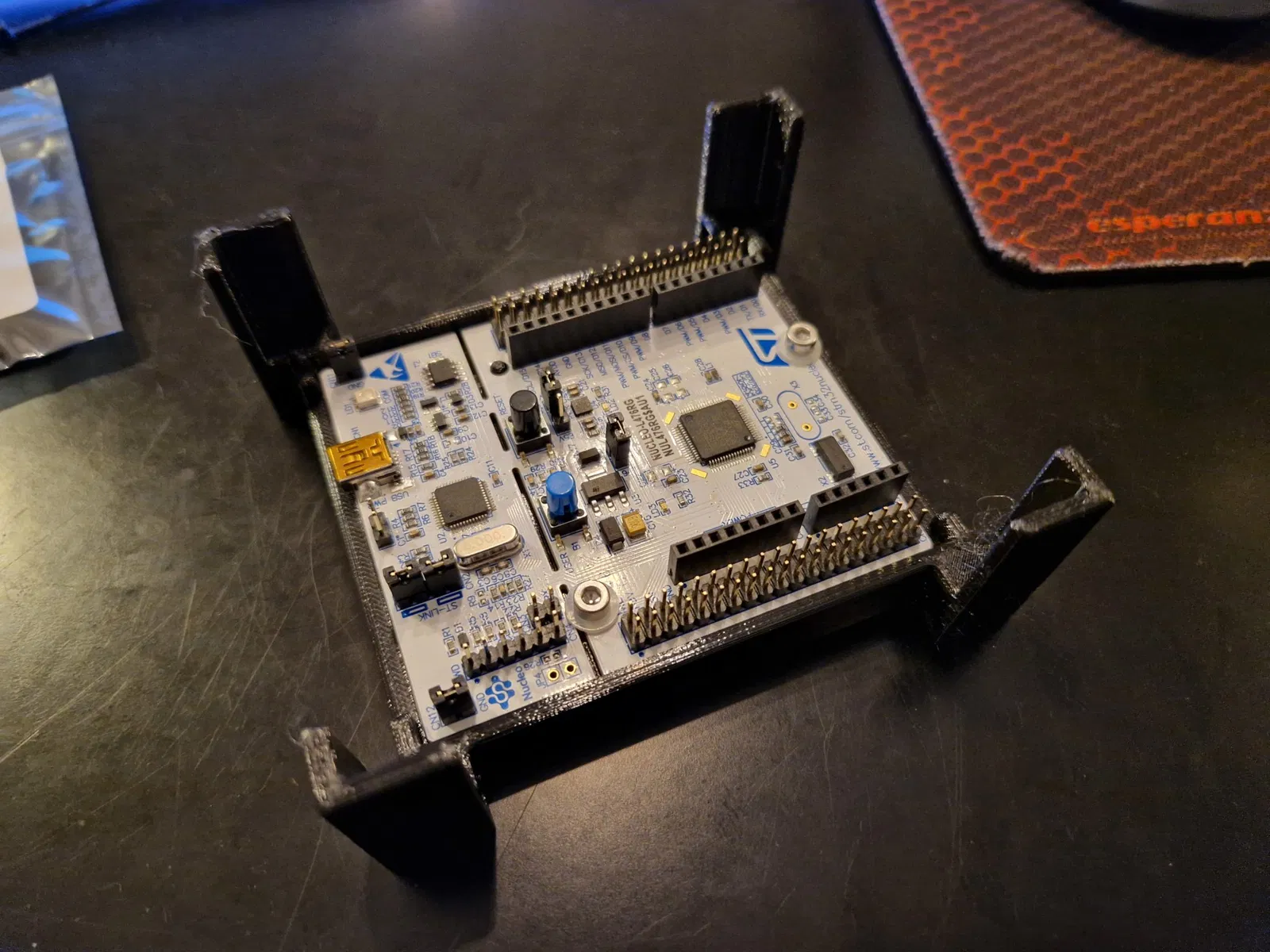 Một đế đơn giản để giữ bảng phát triển STM32 Nucleo-64, giúp bảo vệ các chân dưới không bị chạm vào bề mặt, tránh chập điện và trầy xước. Đế này còn giúp giữ bảng cố định trong hộp carton và không bị rung lắc.