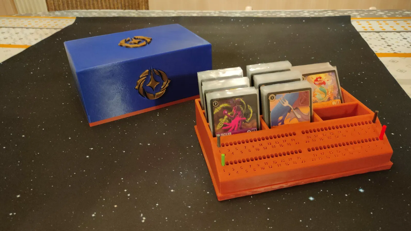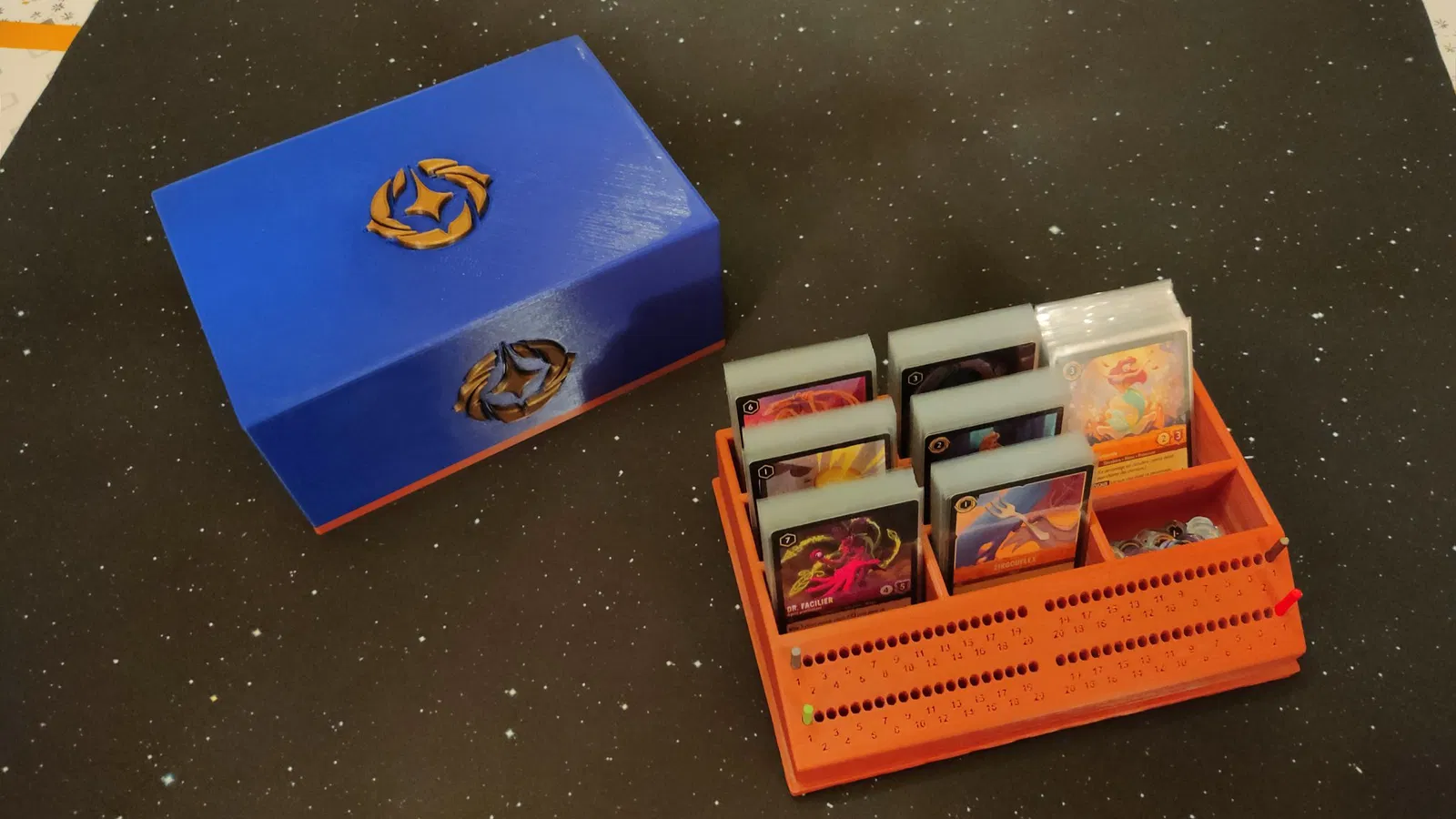 Hộp đựng bài Lorcana được làm bằng Fusion 360, có thang điểm và các ngăn riêng biệt cho từng loại thẻ, bao gồm ngăn lớn cho thẻ dự phòng và ngăn nhỏ cho điểm tấn công. Phù hợp cho các boardgame và cardgame như Lorcana TCG.