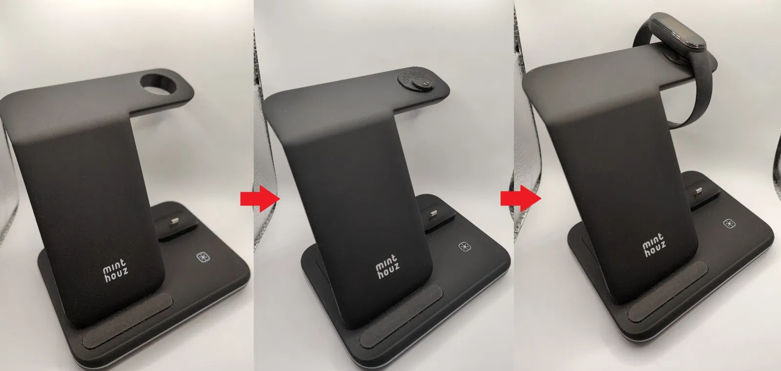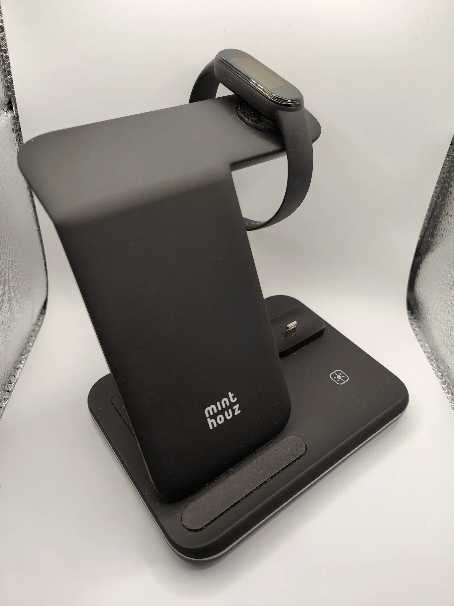 Note: the wireless charger shown seems to be a 3-in-1 generic model sold under various brands. Mine happened to be minthouz branded