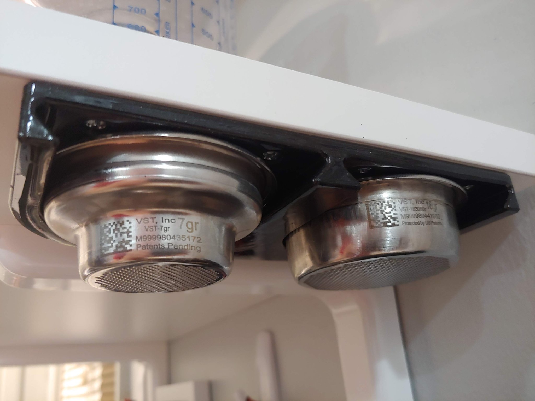 A compact holder for two 58mm portafilter baskets that screws to the bottom of any shelf. There are pockets on the top to press in up to 20 5mmx2mm, round, neodymium magnets that help keep the baskets from rattling out of the holder.