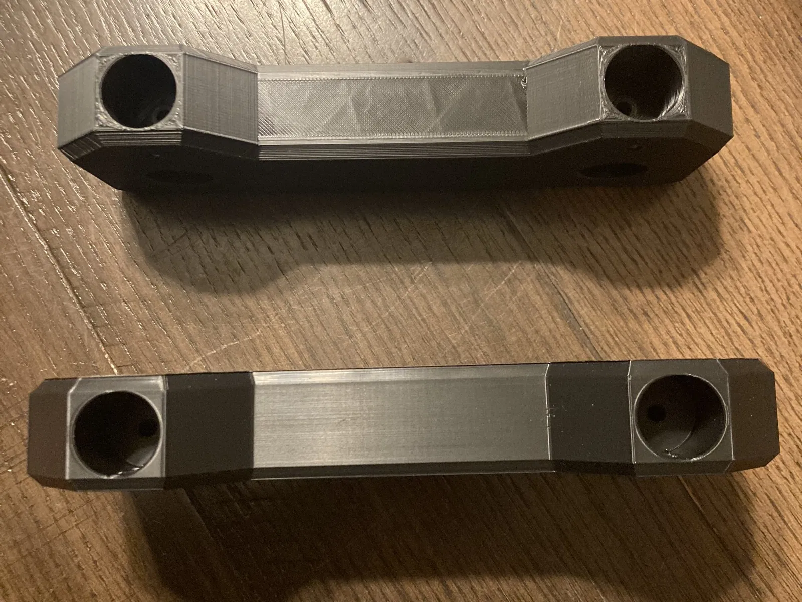 I also have some extension feet for the bottom in the event that you want to add more stability. The feet fit around the horizontal bars on the bottom and each foot attaches with 2 m5 X10mm bolt. The feet can be put on afterwards if you think they are needed. There is a version of the Top/Bottom pieces with holes for the bolts and a version without. There are no feet for the center pieces. I initially didn't use feet but decided to add them after the fact. The bottom piece with the feet added is just over the size of my print bed, hence why they are bolt on.