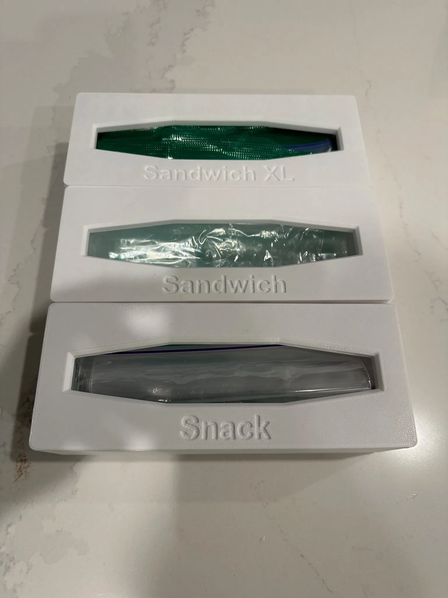 Hộp Gridfinity đựng túi Ziploc loại nhỏ (5x2x7). Có kèm nhãn cho các loại Snack, Sandwich và Sandwich XL.
