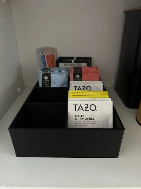 Hộp đựng trà túi lọc – bạn có thể dùng bất kỳ loại sợi nhựa (filament) và cài đặt in nào cũng được. Độ chi tiết không quan trọng lắm, nên khuyến khích in với chiều cao lớp (layer height) lớn.