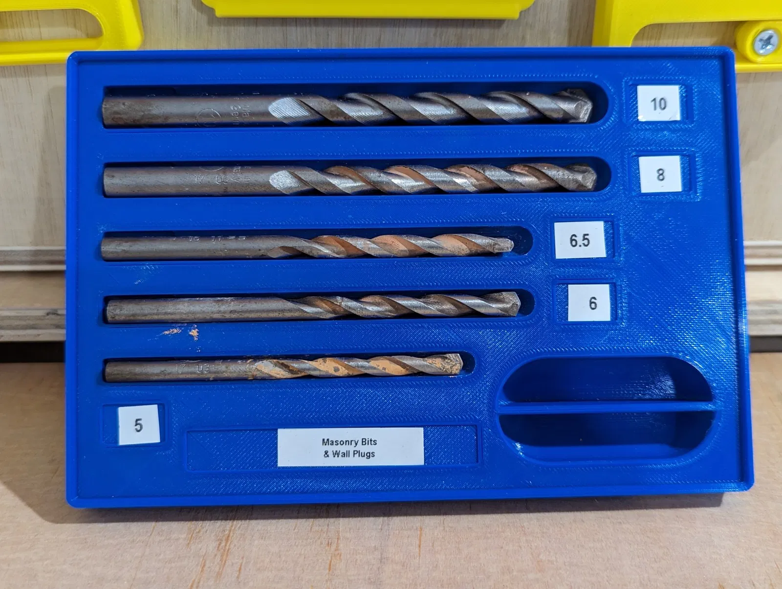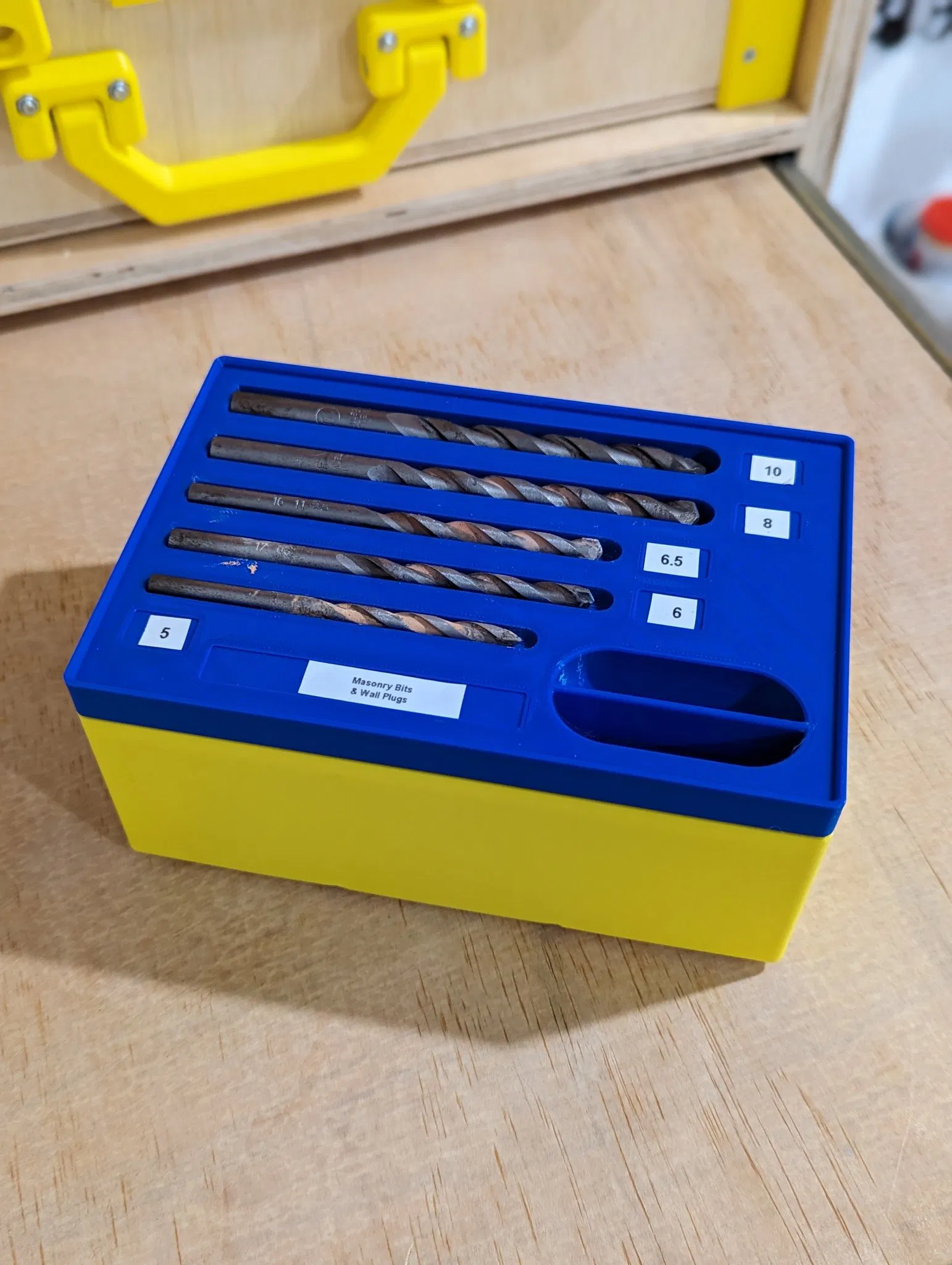 Một phiên bản tùy chỉnh cho hệ thống lưu trữ của Alex Chappel, nơi chứa mũi khoan tường. Vừa vặn với hộp '3x2' tiêu chuẩn, giữ nguyên các tính năng gốc như khoảng cách và nhấn để lấy. In bằng PLA, không cần support.