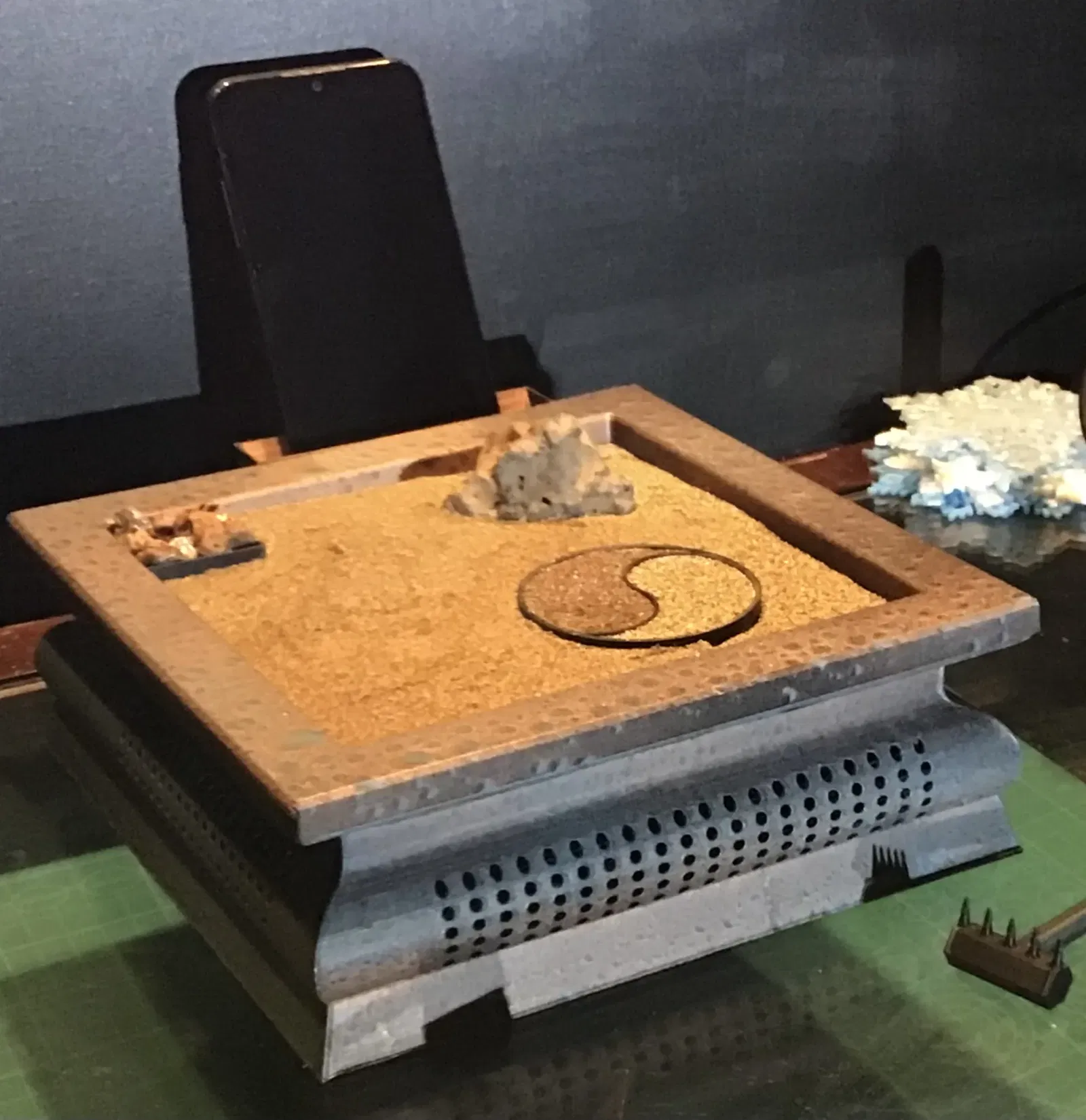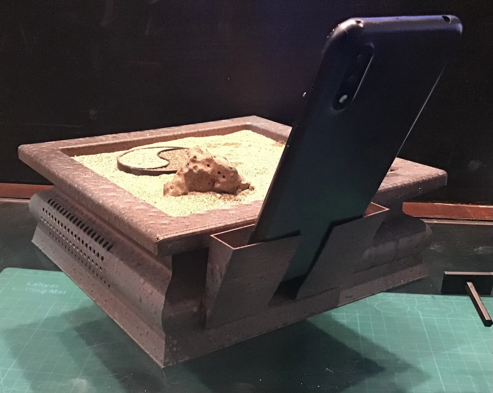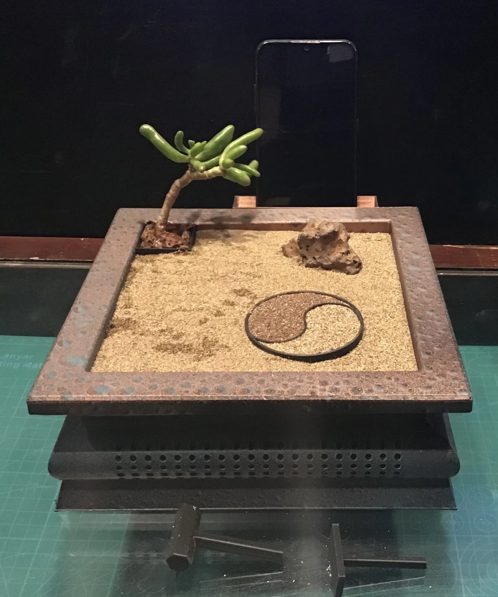 Khu vườn thiền Zen mini vui nhộn này để trên bàn làm việc, có vách ngăn Âm Dương tùy chọn và giá đỡ kiêm bộ khuếch đại điện thoại tích hợp. Hãy bật nhạc thiền êm dịu để thư giãn và bật nhạc rock sôi động để làm phẳng bề mặt cát. Giá đỡ điện thoại cỡ lớn, hy vọng sẽ vừa với hầu hết các loại điện thoại. Tôi đã tạo một khe ở giữa giá đỡ để luồn dây sạc.