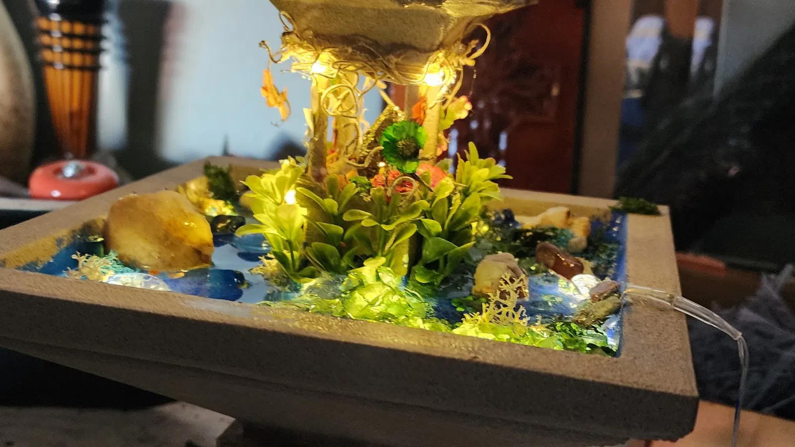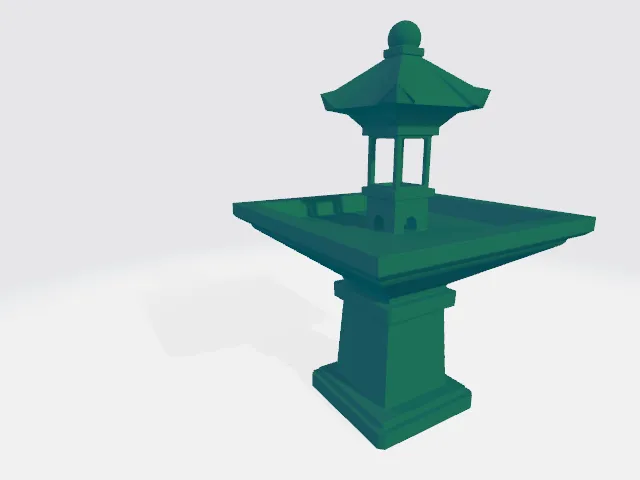 Mình đã thử in một phiên bản lớn hơn trên máy Ender 5 Plus để làm đài phun nước, phóng to lên 800%. Sau đó mình xịt sơn giả đá loại dùng ngoài trời lên để chống thấm nước cho tốt hơn. Cuối cùng là gắn thêm máy bơm nước chìm vào.