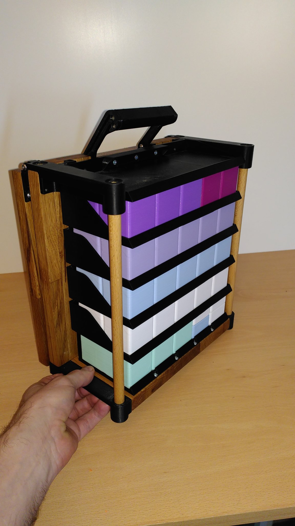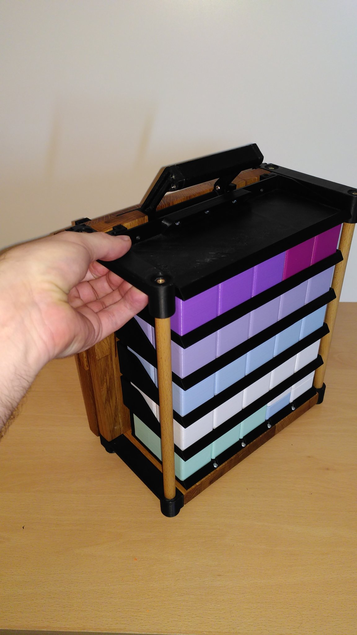 Một bức tường lưu trữ Gridfinity có thể được thu gọn thành một trường hợp nhỏ gọn trong khi không sử dụng. Được thiết kế cho thùng H6.