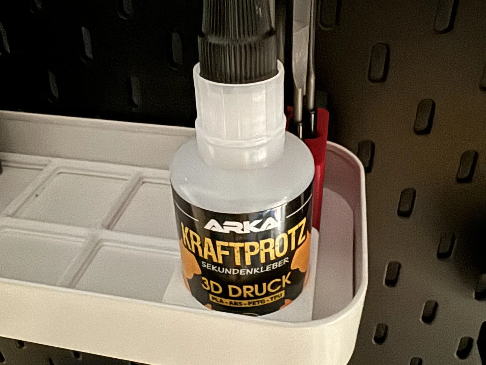 Hộp giữ Gridfinity kích thước 1x1, được thiết kế đặc biệt để đựng chai keo siêu dính Kraftprotz. Giải pháp lưu trữ gọn gàng và tiện lợi cho không gian làm việc của bạn, giữ cho keo luôn sẵn sàng khi cần.