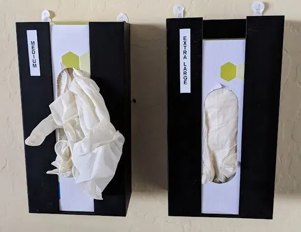 Giá đỡ hộp găng tay cho găng tay Medline hoặc các loại khác. Kích thước được điều chỉnh để phù hợp với các phiên bản hộp găng tay khác nhau, có thể dán tường bằng command strips, in bằng PLA với độ dày lớp 0.2mm.