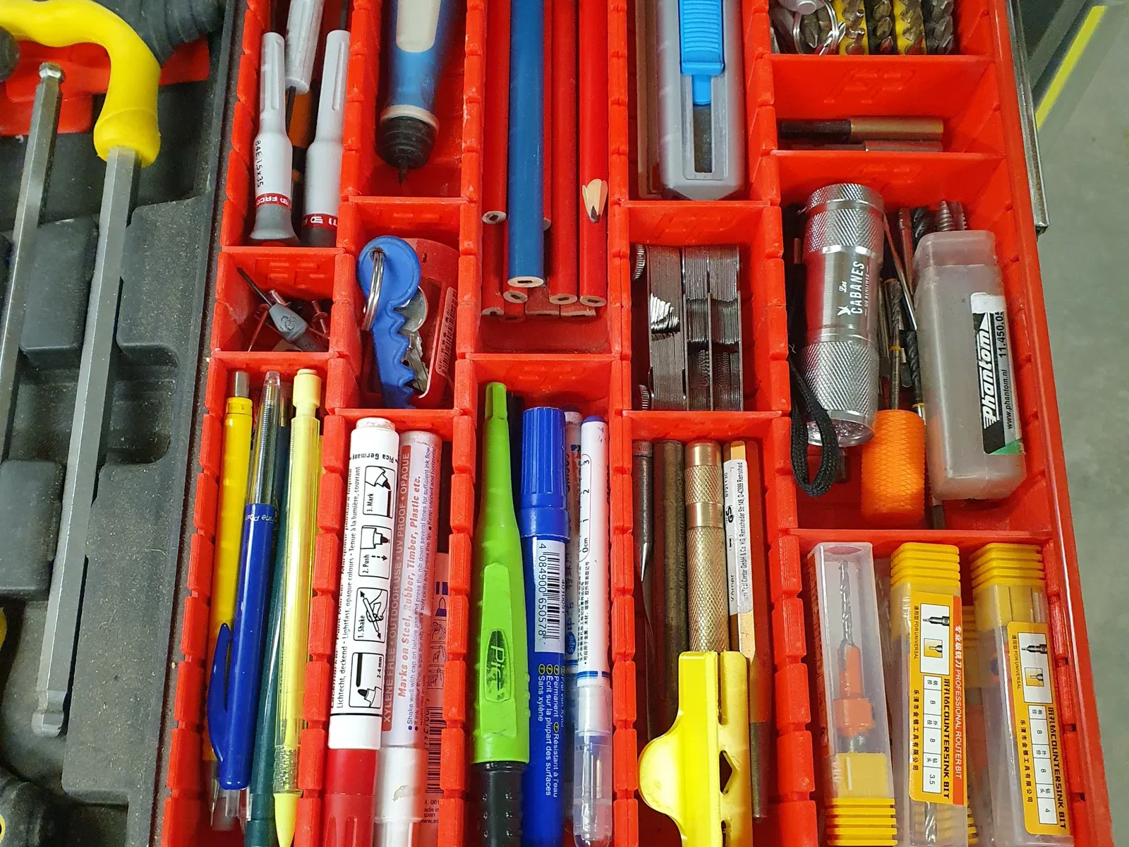 Khay đựng đồ cho ngăn kéo dụng cụ. Bạn có thể tùy chỉnh các vách ngăn bên trong để phù hợp với chiều dài khác nhau của các loại dụng cụ, giúp không gian cất giữ gọn gàng và ngăn nắp hơn.