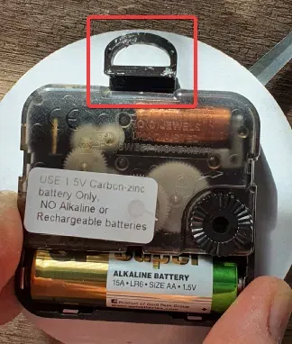Tôi mua bộ máy đồng hồ về nhà nhưng lại chẳng có gì để treo nó lên tường cả. Cái móc này sẽ móc vào trục và tại vị trí này tạo ra điểm neo tốt, giúp bạn dễ dàng treo đồng hồ.