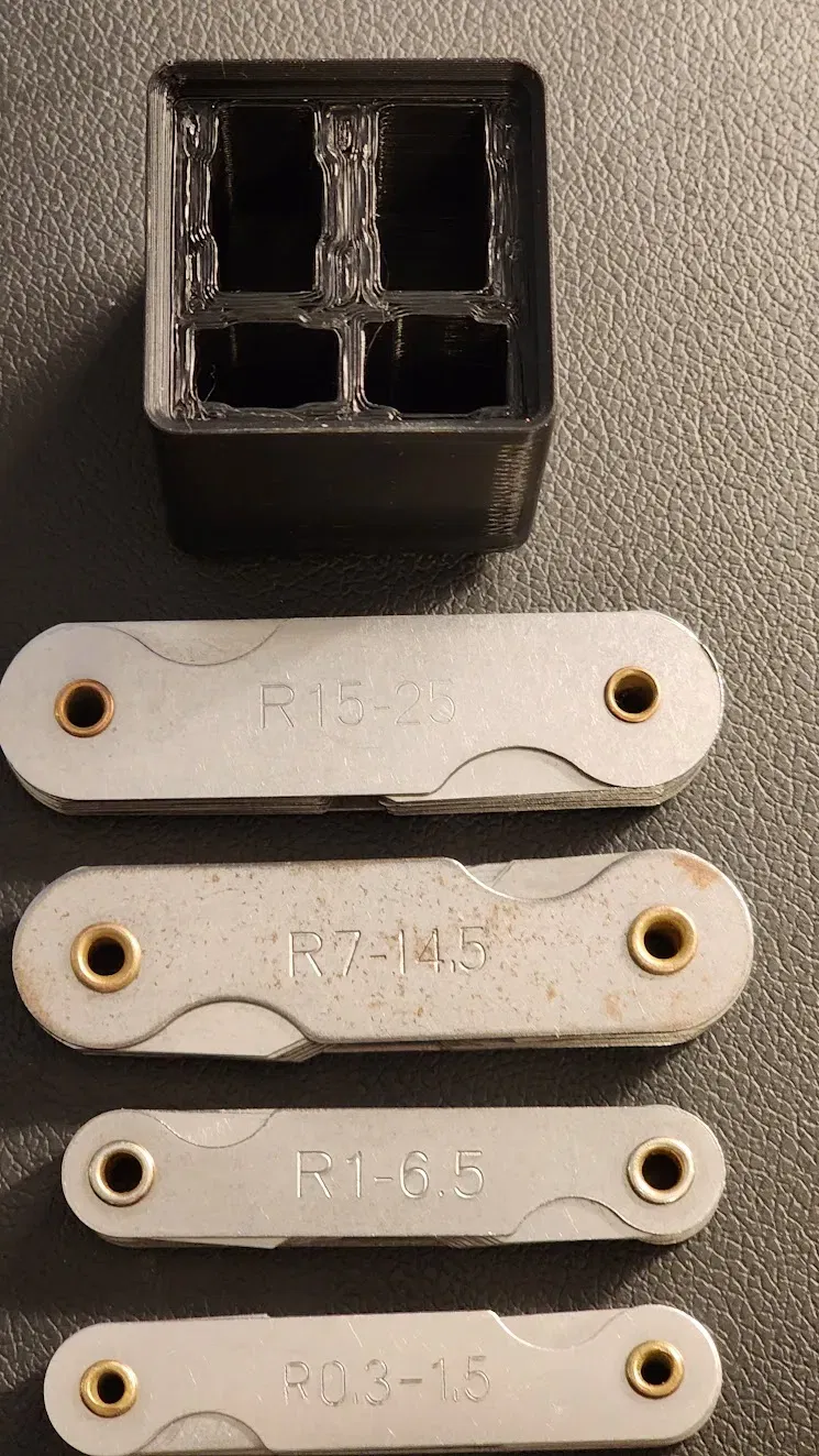 Một khay Gridfinity được thiết kế để chứa bộ dưỡng bán kính bằng thép sau đây, hoặc các loại có kích thước tương tự.