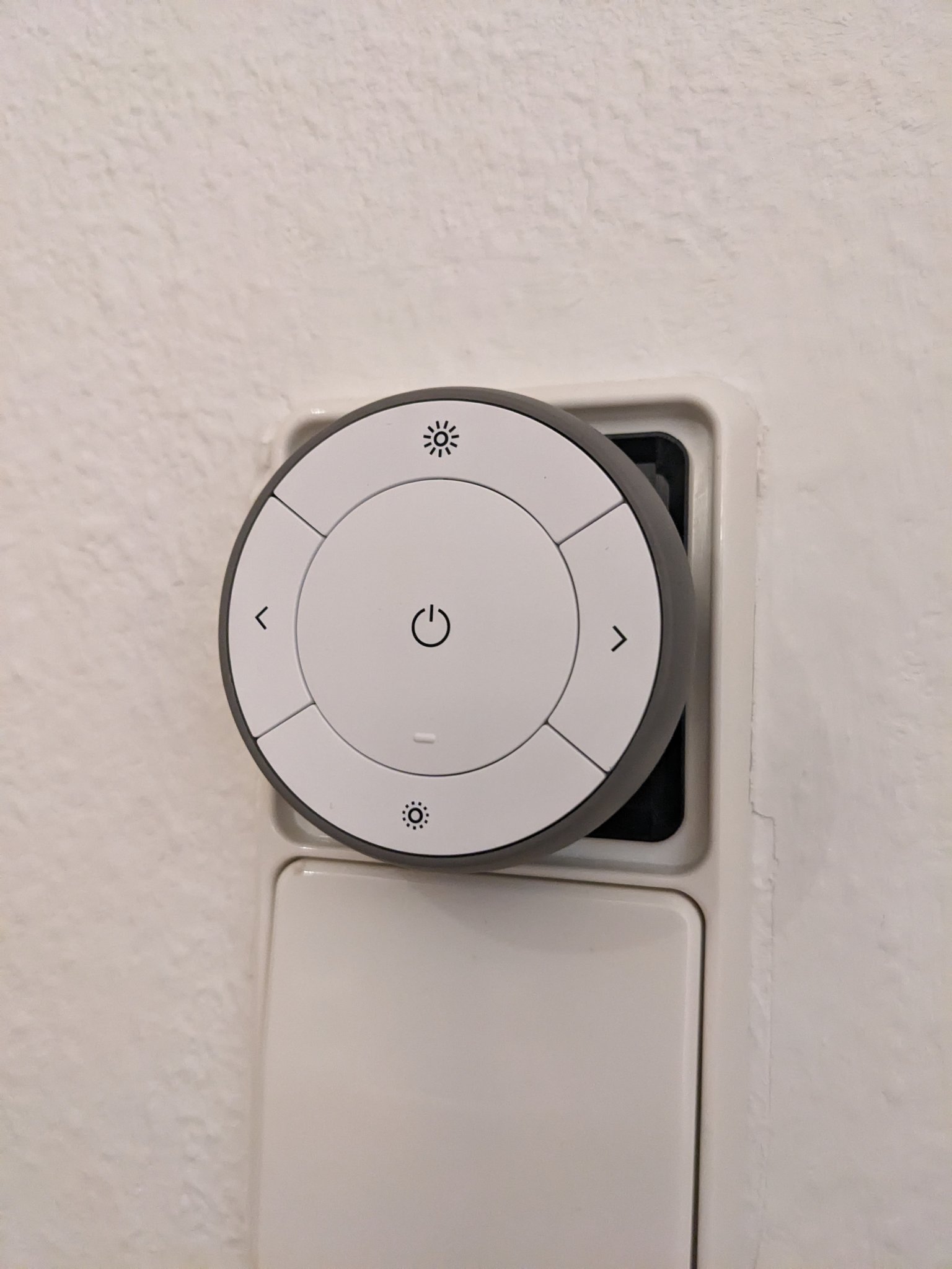 Bộ điều hợp để gắn một điều khiển từ xa IKEA Tradfri vào tấm kết nối của một công tắc ánh sáng ở Đức.