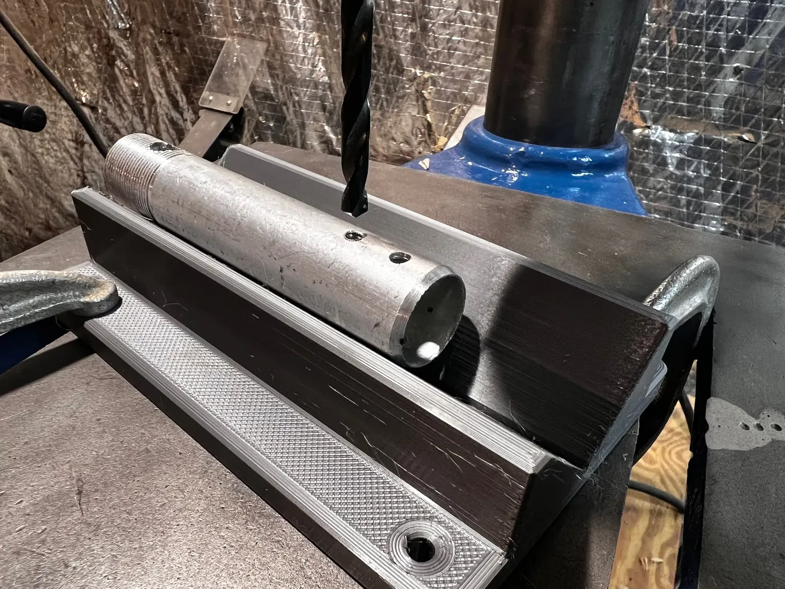 Cái khuôn khoan này sẽ giúp bà con giữ và canh chỉnh cho ngay ngắn mấy cái phôi tròn hay ống khi mình xài máy khoan bàn đó nghen. Anh em thợ mộc, thợ cơ khí hay ai làm đồ thủ công đều xài được hết á.