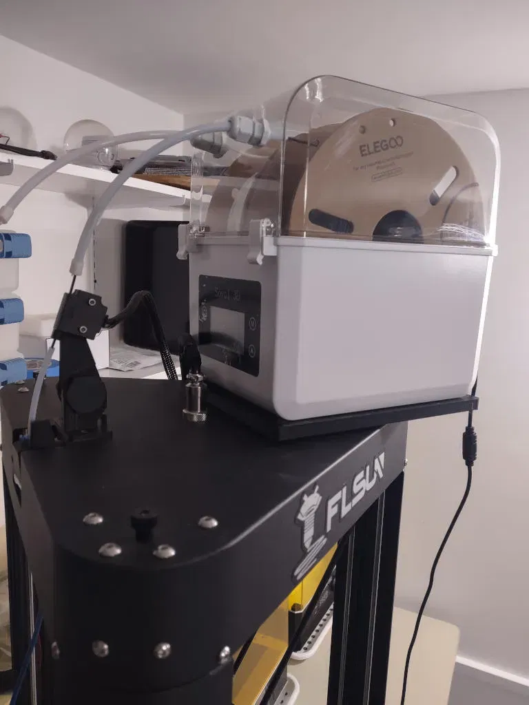 Phần này là một bệ đỡ gắn chắc chắn lên trên máy FLSUN QQ-S Pro. Nó có các rãnh để chân của máy sấy filament Sovol SH-01 có thể khóa chặt vào đó. Bằng cách này, máy sấy sẽ được cố định trên đế của nó.