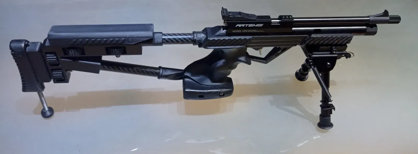 Báng súng này dành cho mẫu Artemis CP2 và Diana Chaser, có cả phiên bản súng trường và súng lục. Sử dụng ốc M5 và thanh ren T8/2 với các ống nối bằng sợi carbon. Bạn có thể chọn in ren hoặc lắp ren có sẵn.