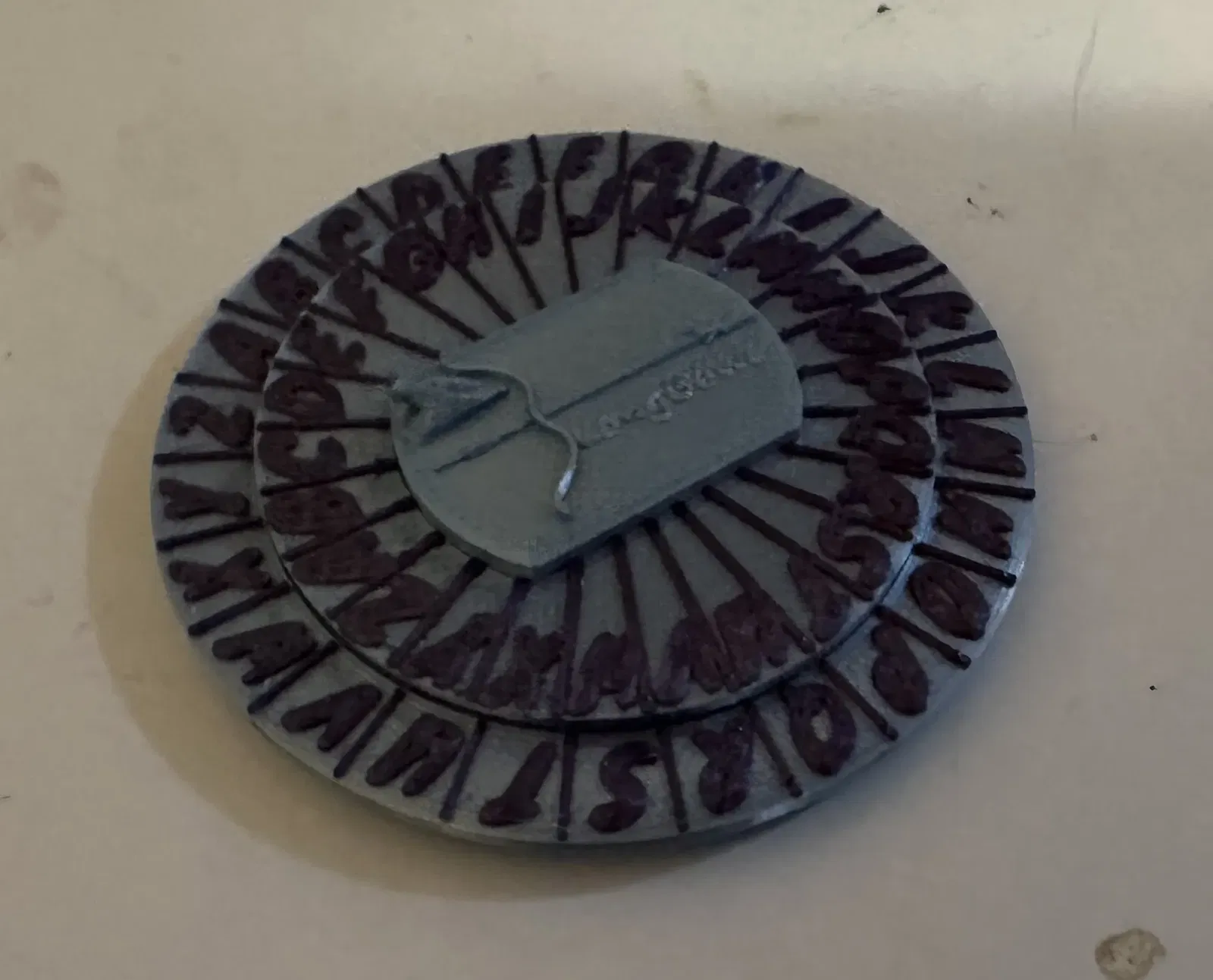 Một bánh răng giải mã giống như bạn từng thấy trong các hộp ngũ cốc, được làm cho một nhân vật trong vũ trụ Dagger's Stray Cat Strut của Raven. Phần chữ cái được in nổi bật hơn bằng cách đổi màu sợi dây tóc ở giai đoạn cuối.