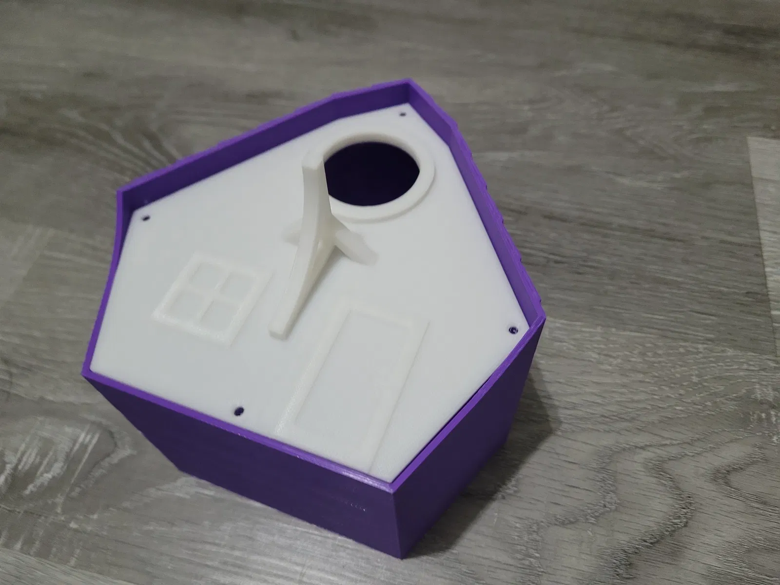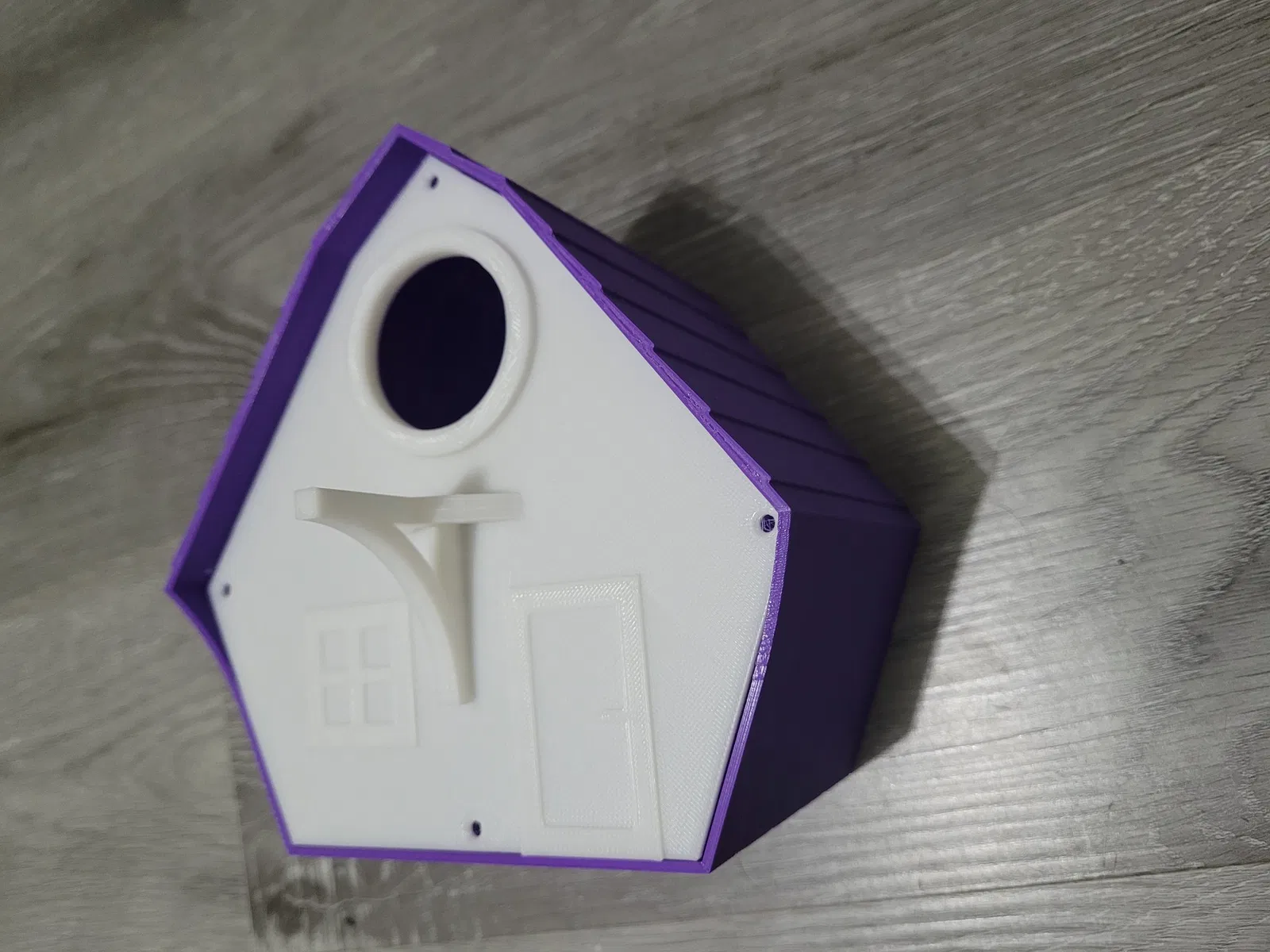 Thiết kế hai phần: Chiếc nhà chim này bao gồm hai phần chính - hộp chính và mặt trước. Hộp chính được thiết kế để gắn chắc chắn vào tường, cột hoặc cây bằng ba lỗ có sẵn ở phía sau. Mặt trước dễ dàng kết nối với hộp chính bằng bốn vít tự ren M3, đảm bảo việc lắp ráp chắc chắn và tiện lợi.